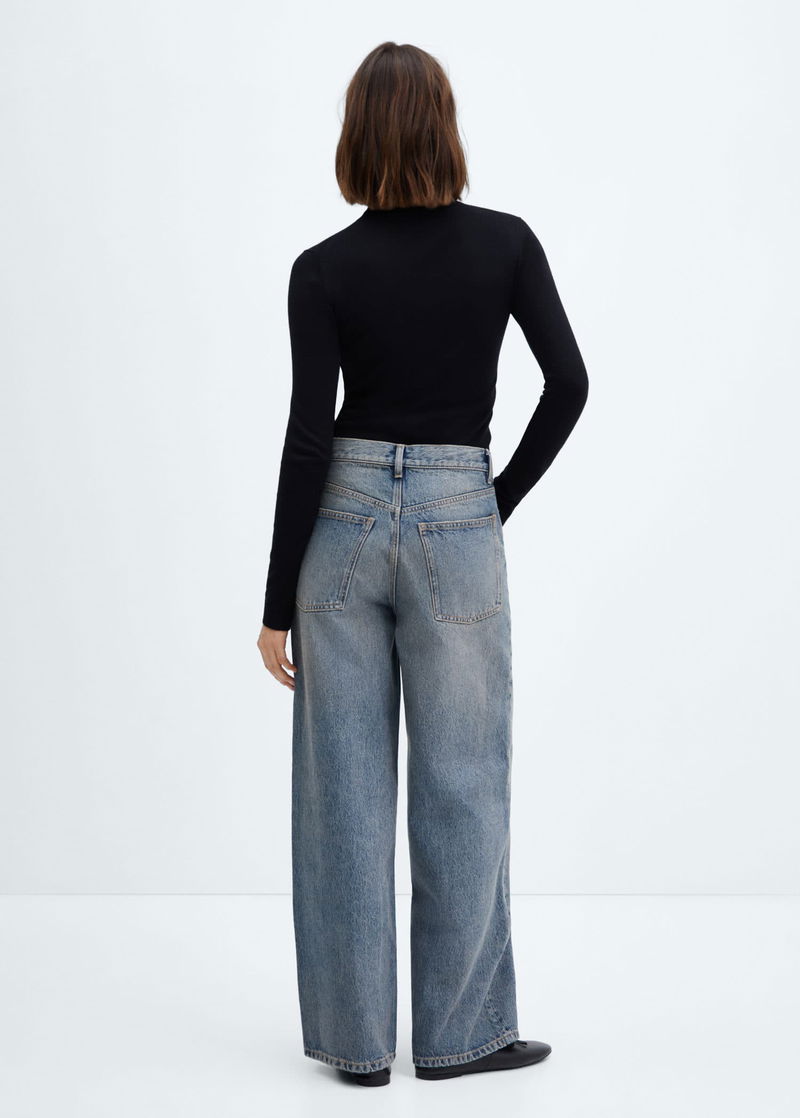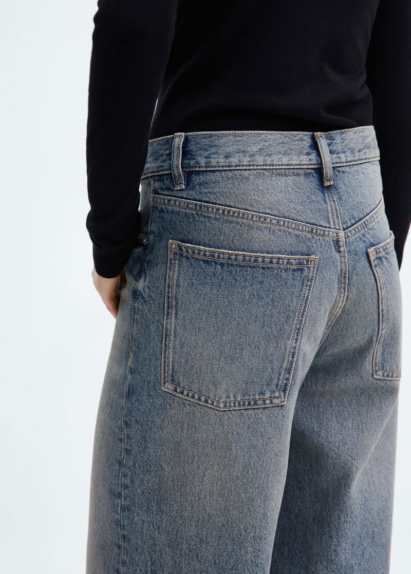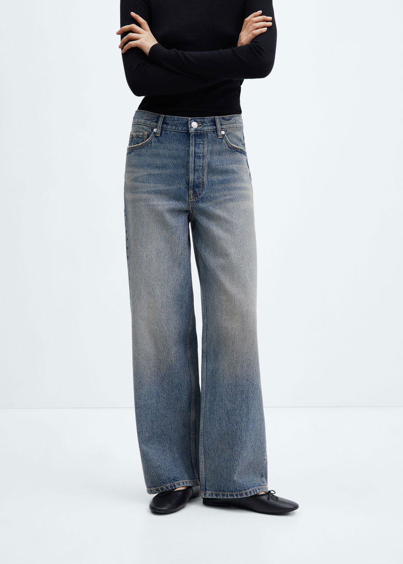 Denim style cotton fabric, Long design, Wide-leg design, Medium waist, Loops, Five pockets, Button up.