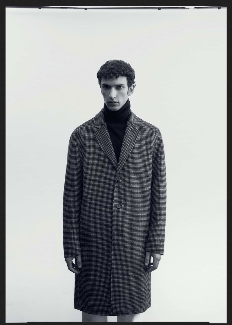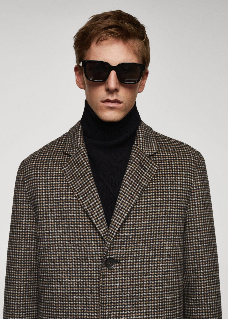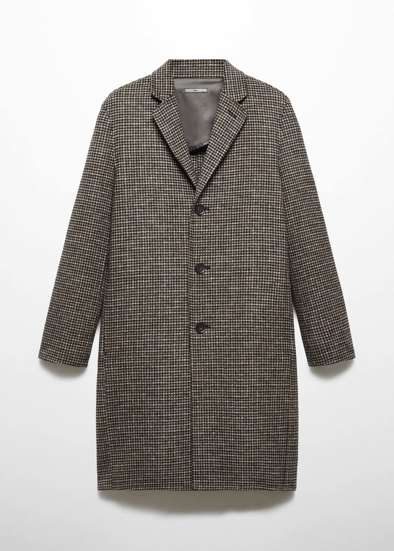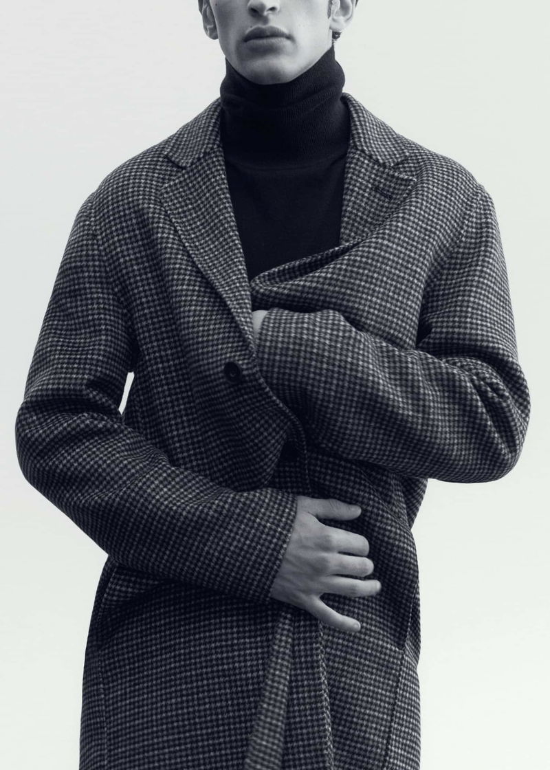 Wool mix fabric, micro houndstooth print, straight design, lapel-collar, front button closure, long sleeve, partial lining, back-slit hem.