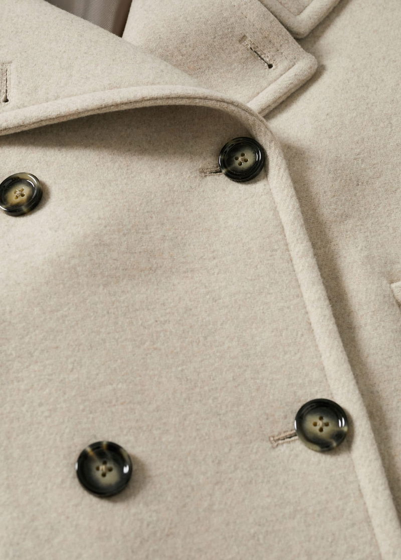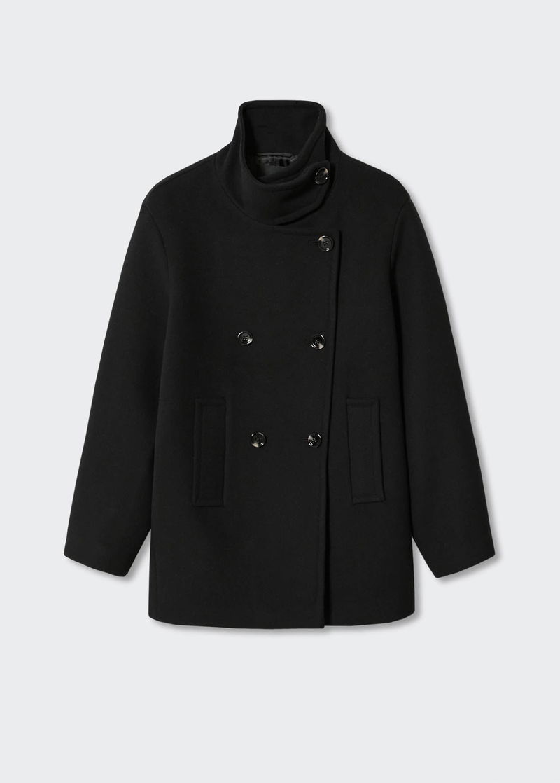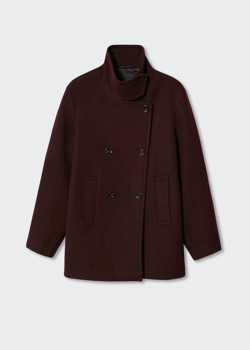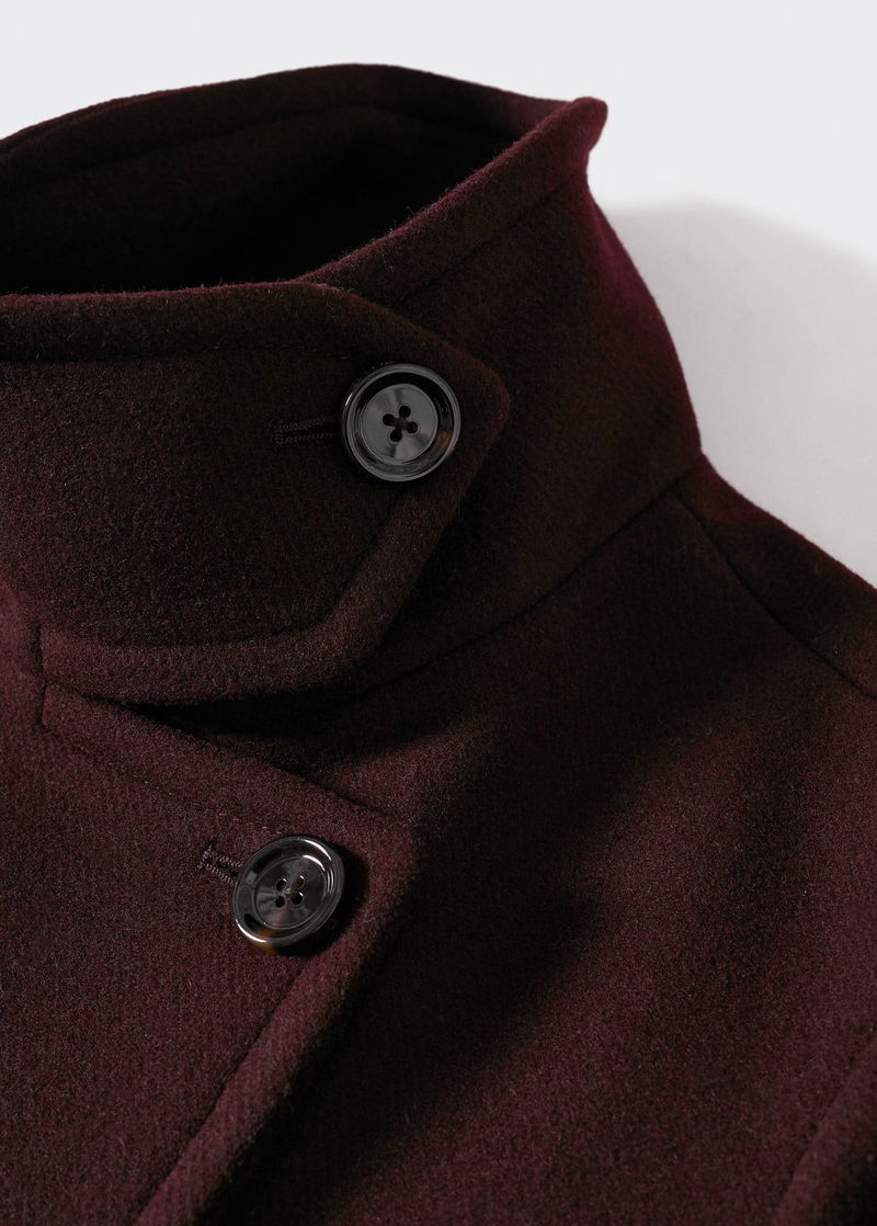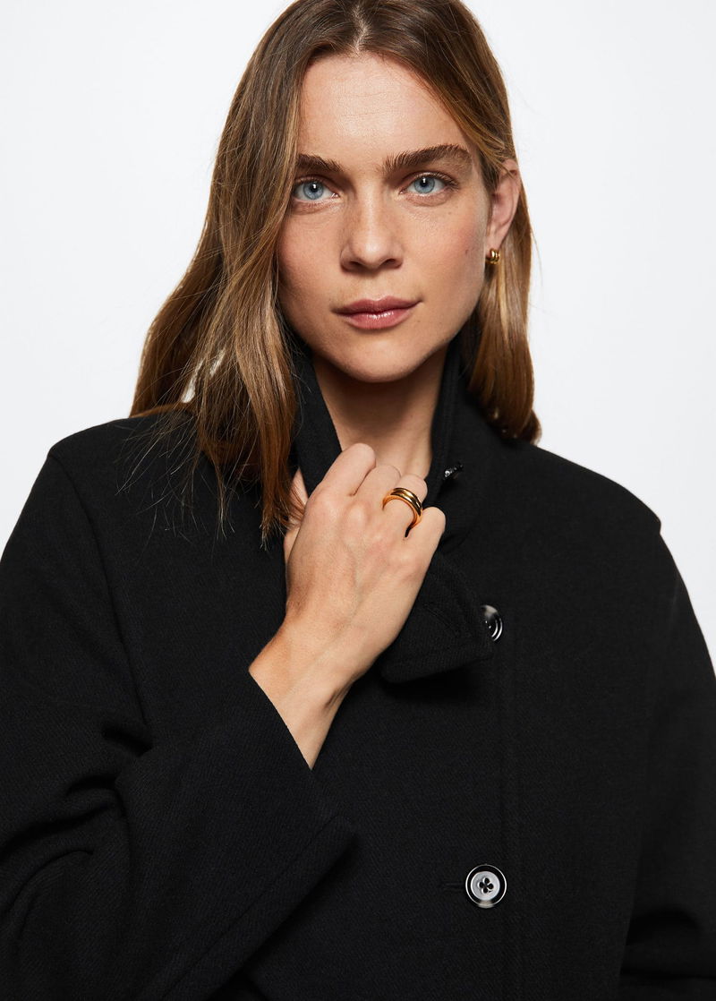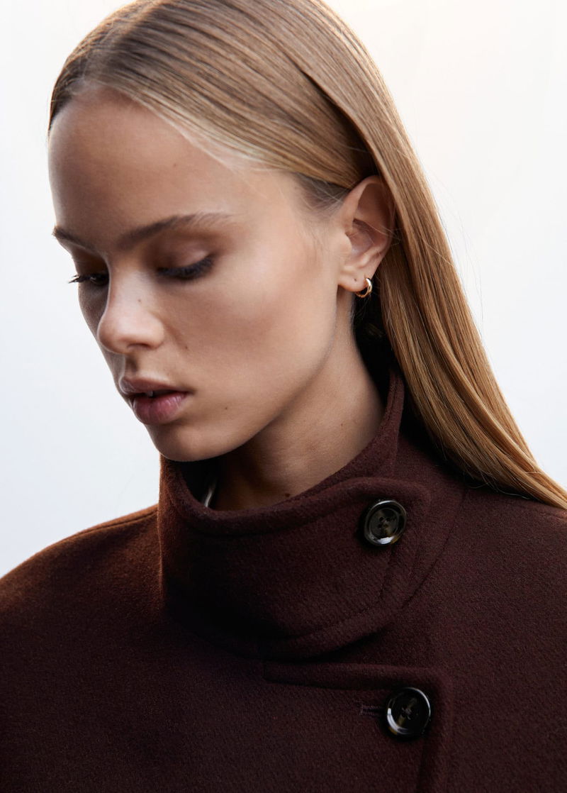Committed Collection, Recycled wool mix fabric, Recycled polyester blend fabric, Straight design, Crossover design, Funnel neck, Buttoned collar, Long sleeve, Double button fastening, Two front pockets, Inner lining.