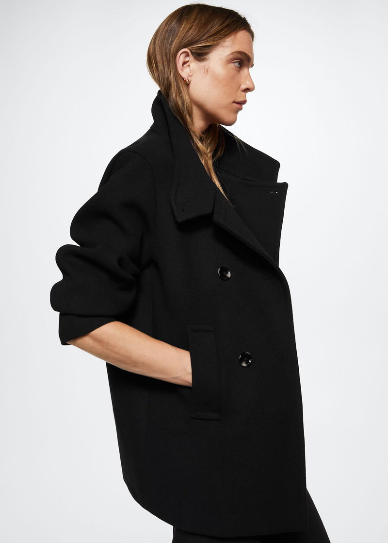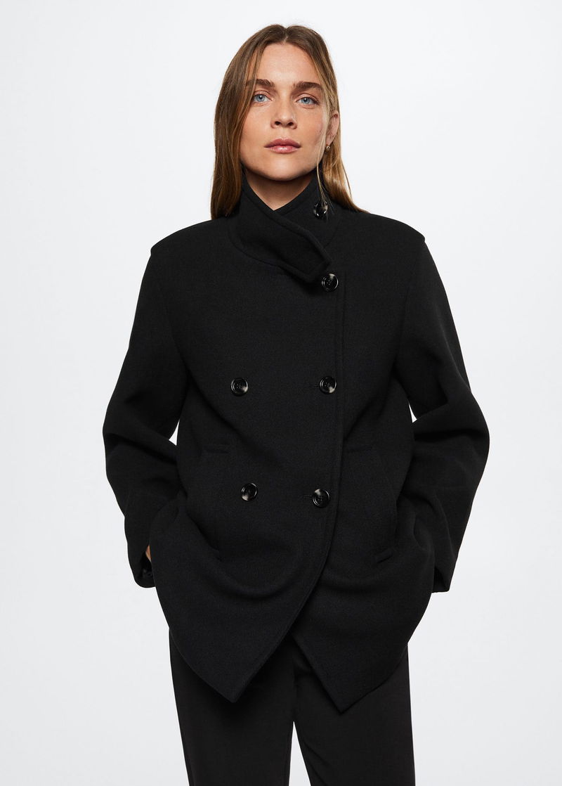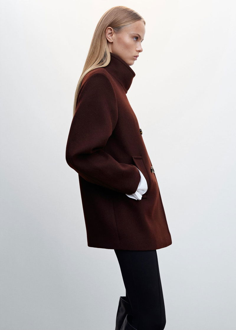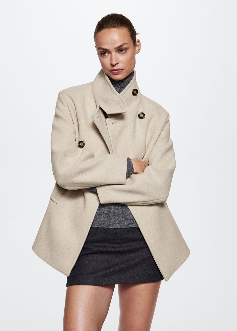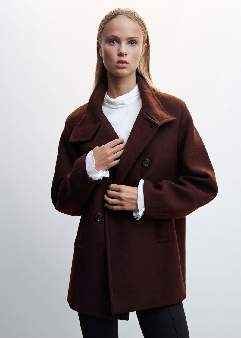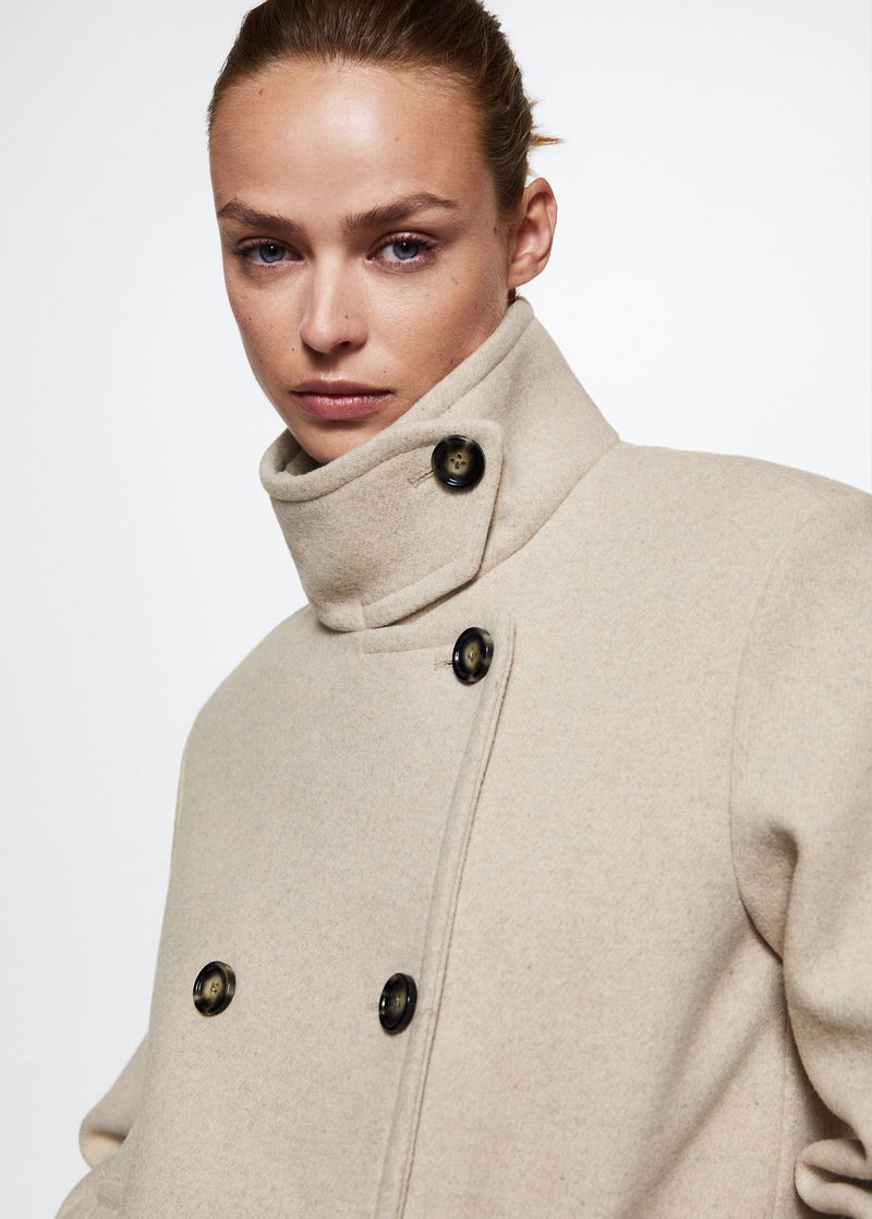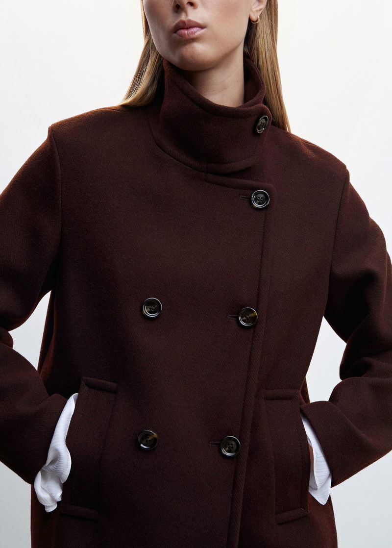 Committed Collection, Recycled wool mix fabric, Recycled polyester blend fabric, Straight design, Crossover design, Funnel neck, Buttoned collar, Long sleeve, Double button fastening, Two front pockets, Inner lining.