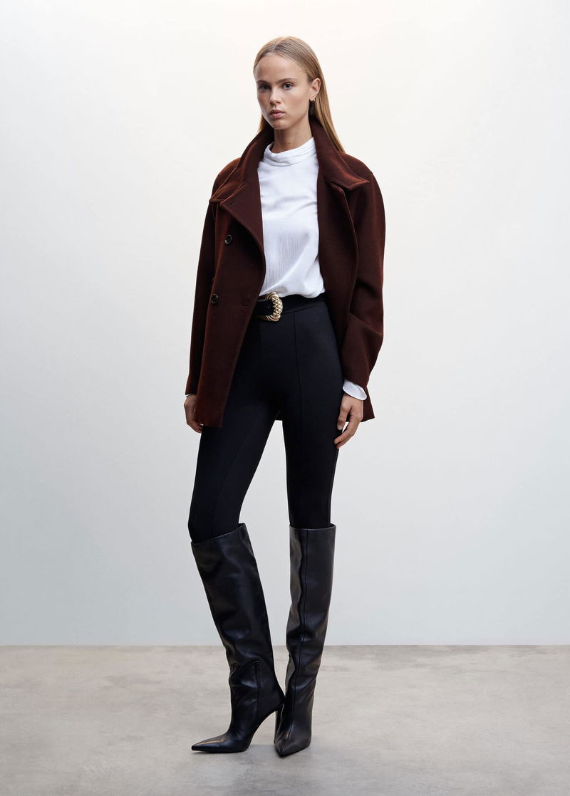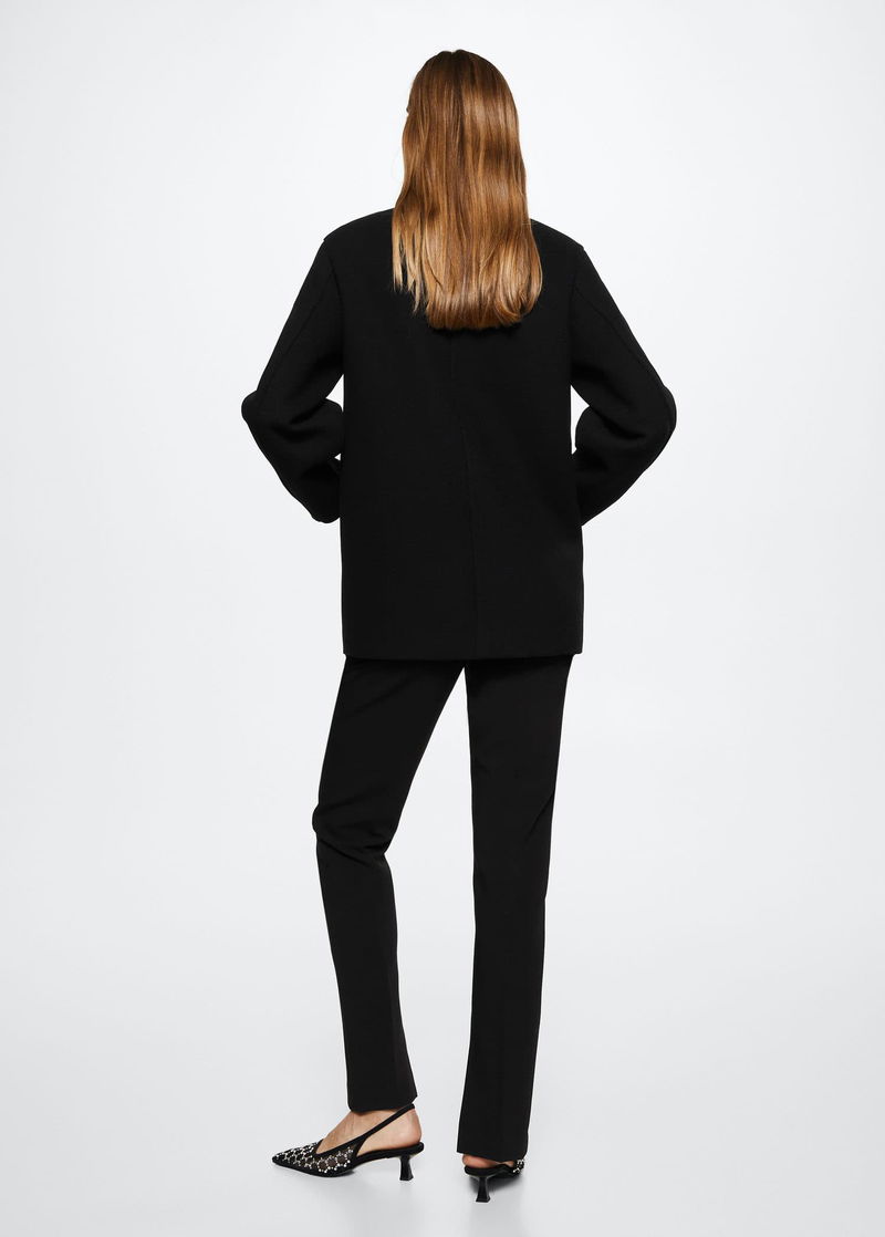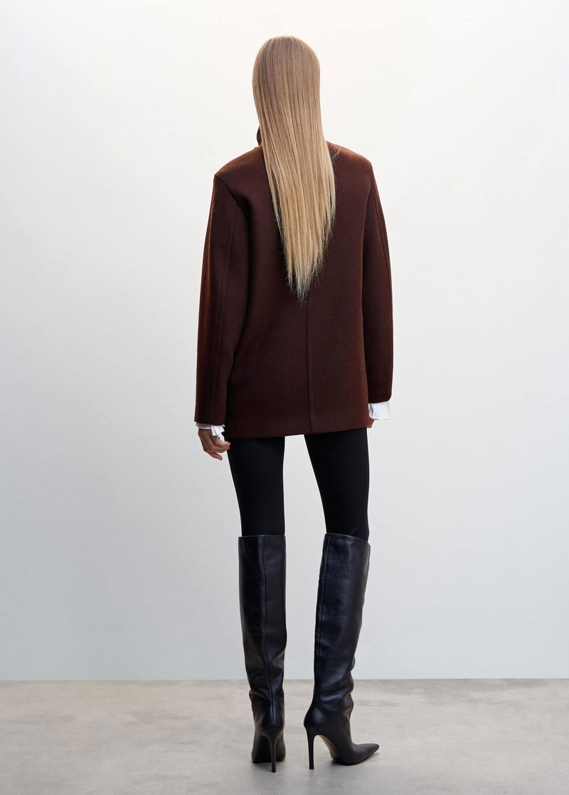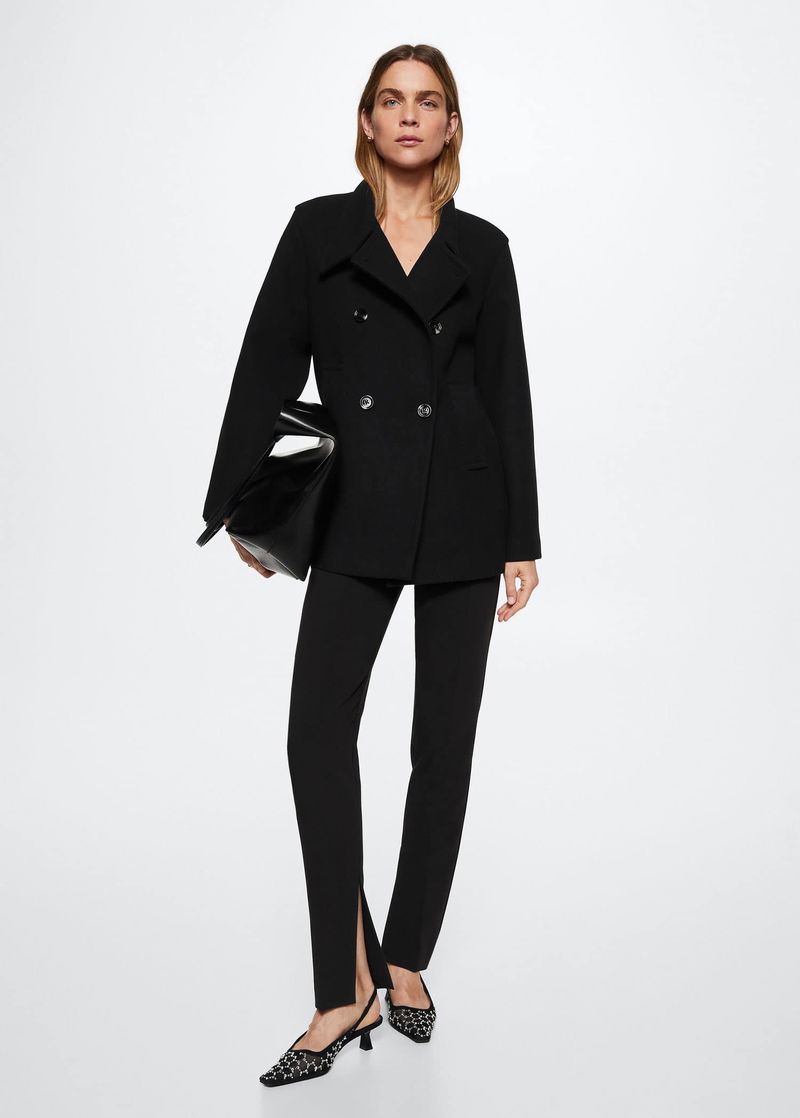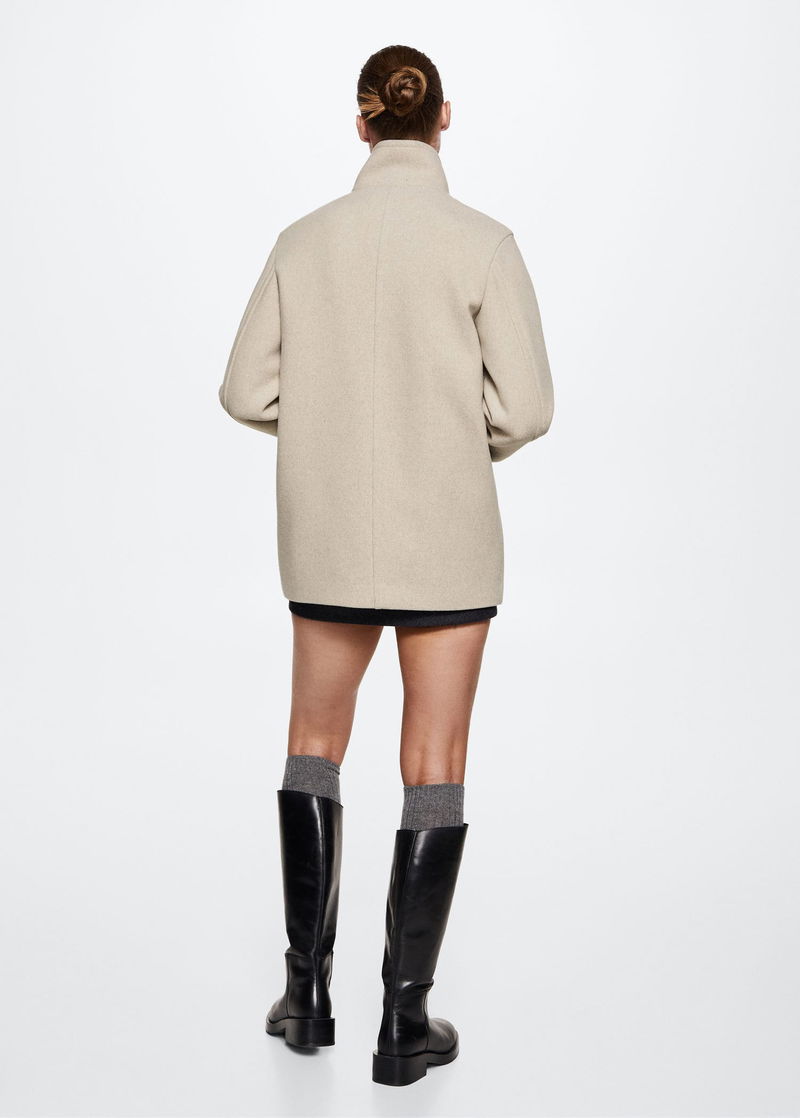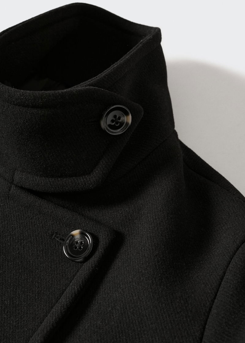 Committed Collection, Recycled wool mix fabric, Recycled polyester blend fabric, Straight design, Crossover design, Funnel neck, Buttoned collar, Long sleeve, Double button fastening, Two front pockets, Inner lining.