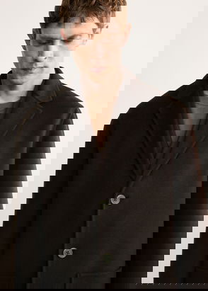 Wool mix fabric. Slim fit. Medium Length. Button-down collar with button closure. Button fastening at the front. Two front welt pockets. Long sleeves with buttoned strip cuffs. Inner lining.