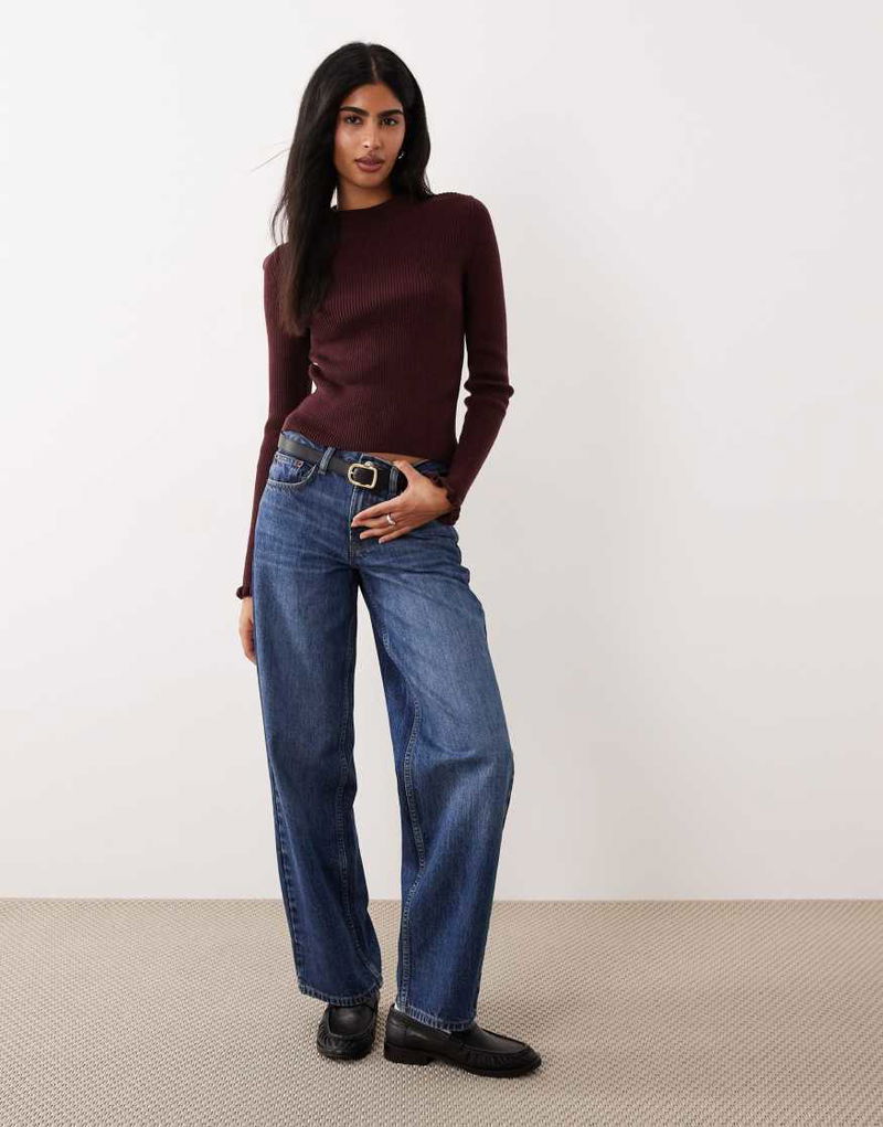 Wool Mix High Neck Frill Edge Knitted Top In Burgundy