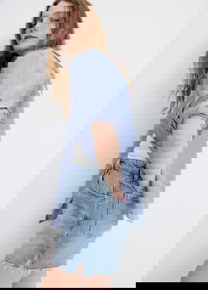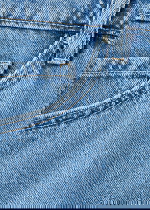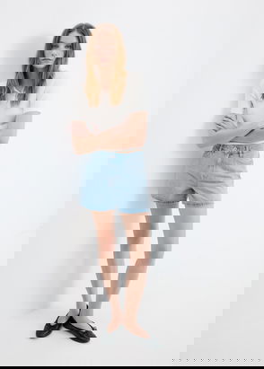 Denim-style cotton fabric. Short design. Skort. Wrap design. Medium waist. Front button closure. Zip fastening on the back section.