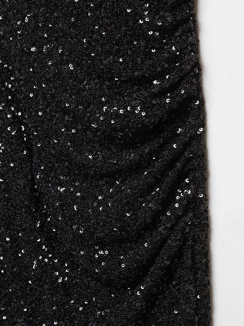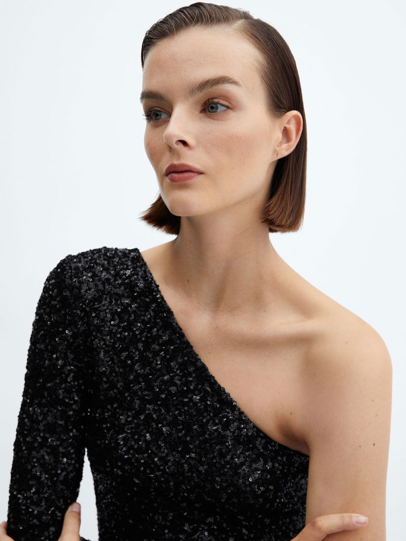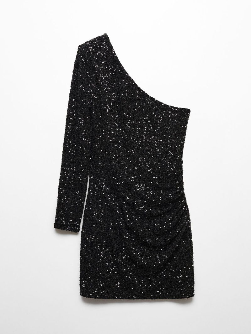 In a shape that skims close to your figure, this mini dress from Mango is a favourite for party season. Confidently cut with an asymmetric neck and one long sleeve, it is strewn with black sequin embellishment from neckline to hem.