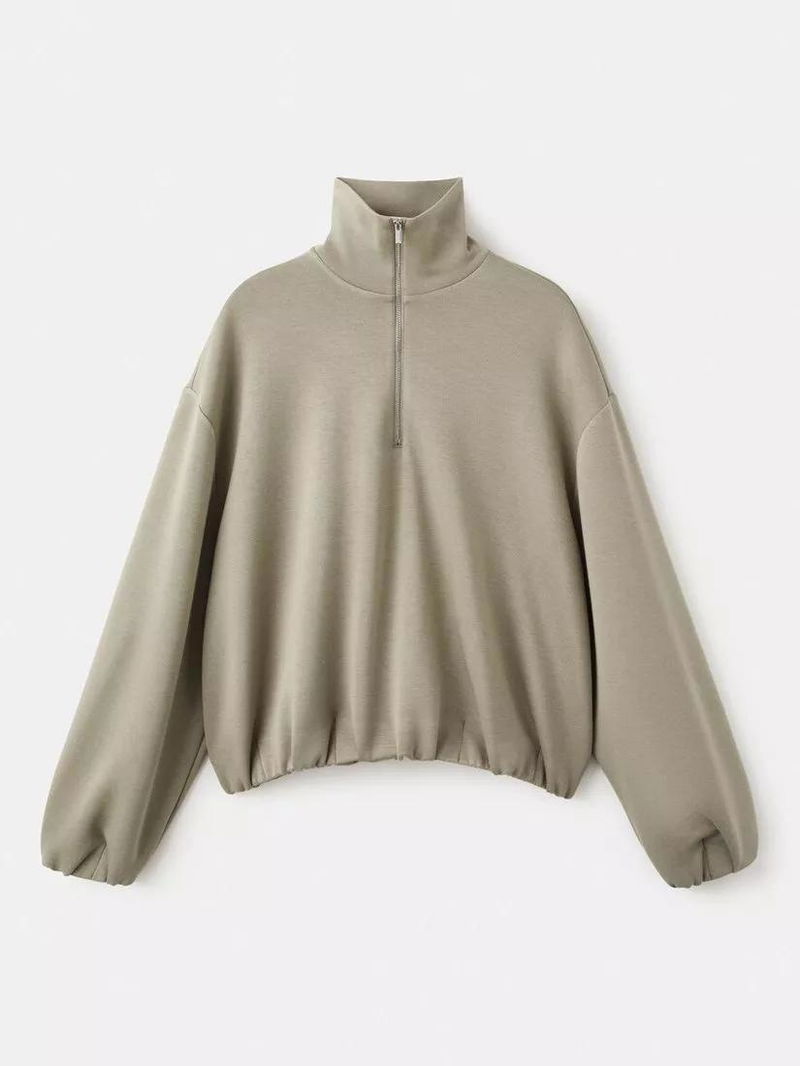 Zip Neck Half Cropped Sweatshirt, Khaki