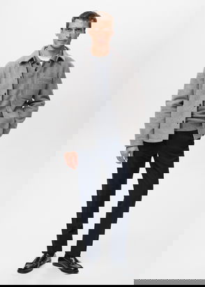 Straight silhouette. Lapel collar. Two side pockets. Ribbed cuffs and hem. Front zip closure.