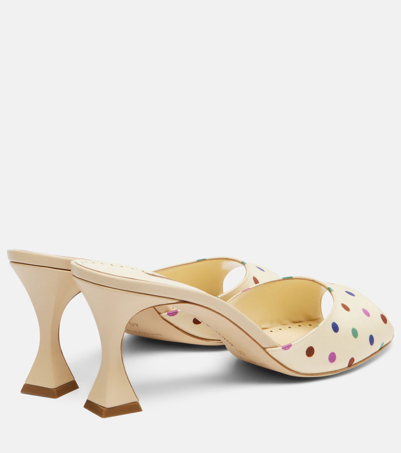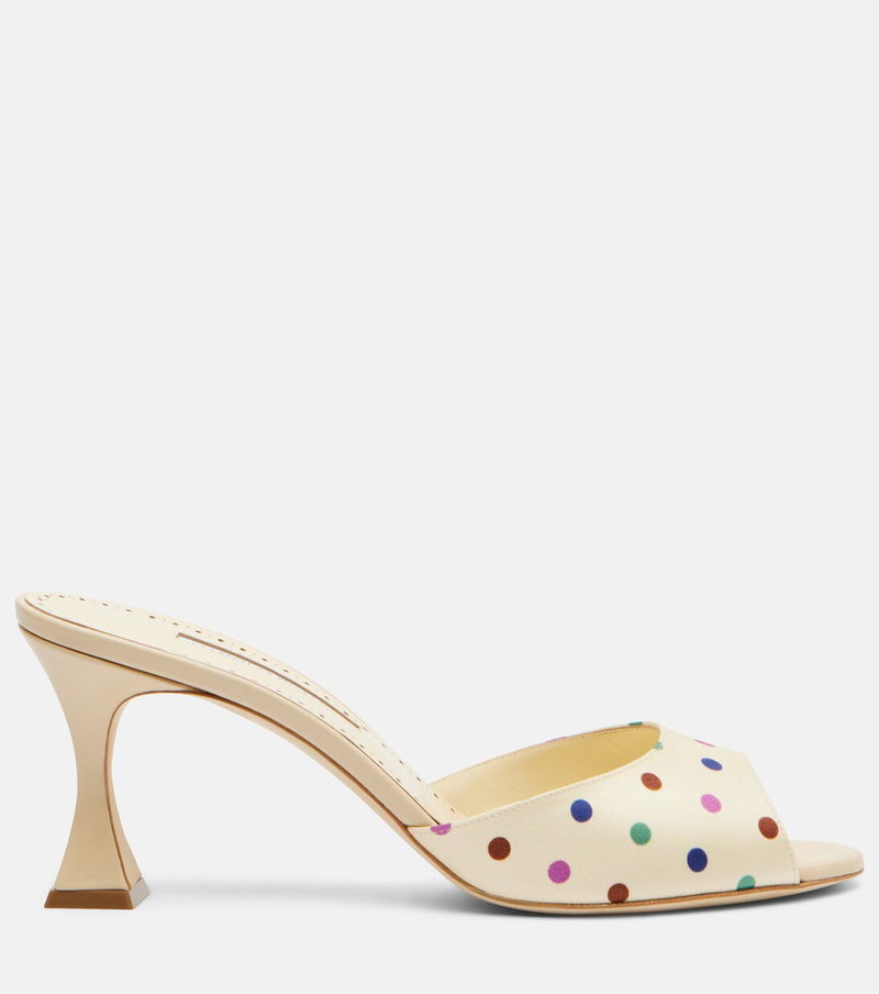 One of the world's most celebrated shoe designers, Manolo Blahnik stands on the pillars of creativity and craftsmanship. Carefully crafted in Italy from twill with colorful polka dots, the Jadaron mules rest atop flared kitten heels.