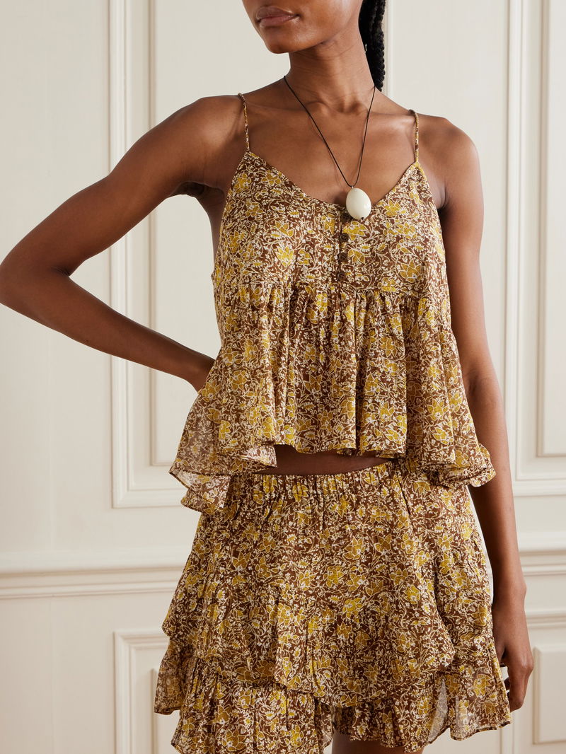Marant Étoile's youthful collections are imbued with a free-spirited, bohemian vibe. This 'Lirhetta' camisole is made from certified organic cotton-voile that's patterned with floral motifs and has a floaty, ruffled hem. Wear yours with shorts.