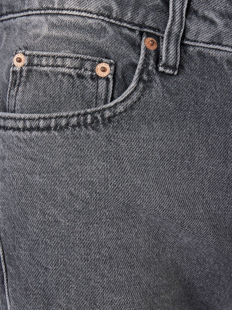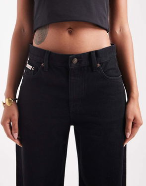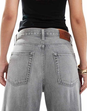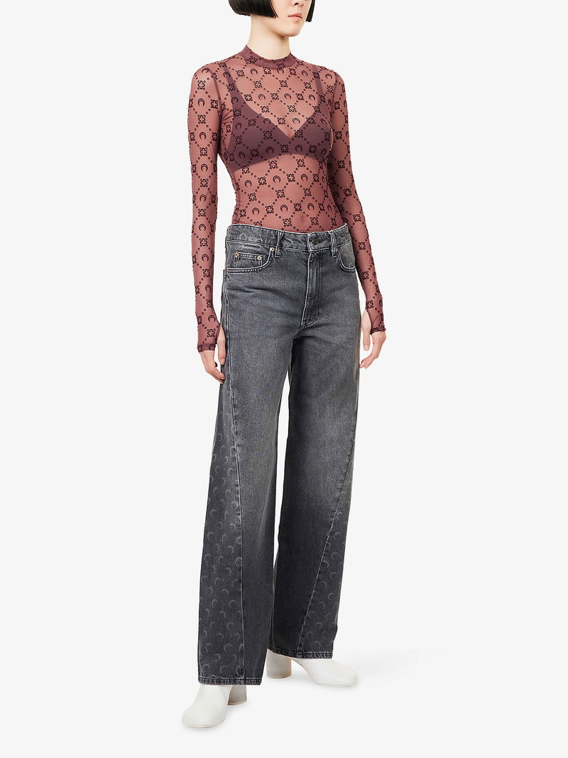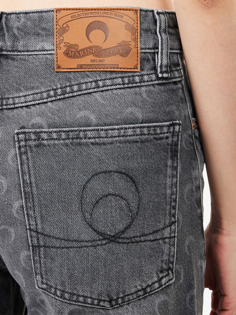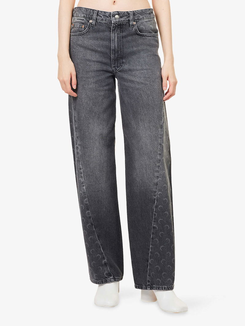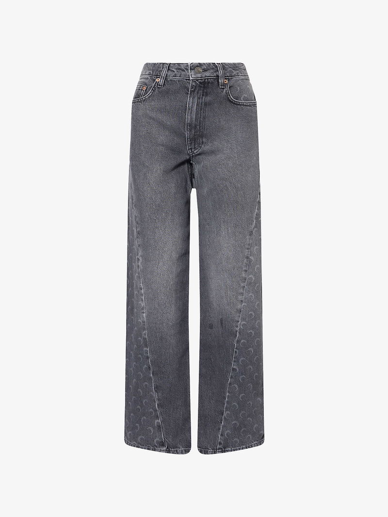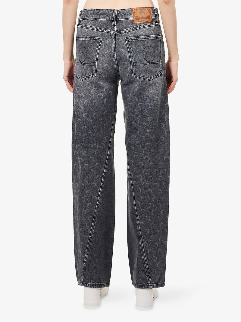 Marine Serre denim jeans. Baggy fit, high-rise, wide leg, belt loops, five pockets, twisted seam at front, brand patch at back, moon print at back and sides, faded wash.
