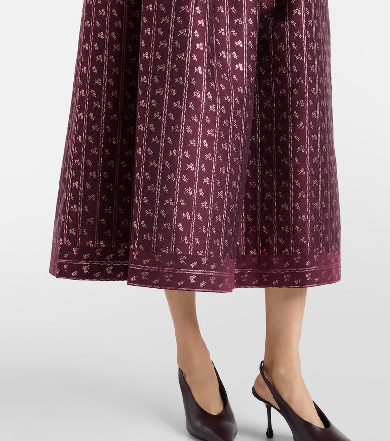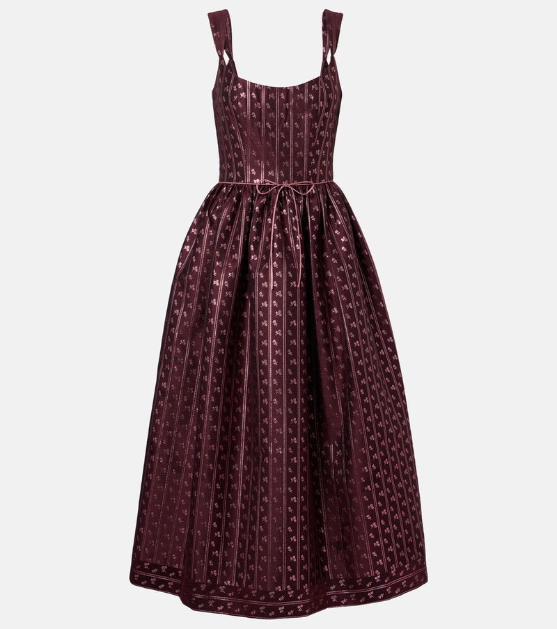 The Apple midi dress from Markarian combines a structured corset bodice with a voluminous skirt for timeless elegance. The design is rendered in a rich burgundy hue and adorned with a delicate bow detail.