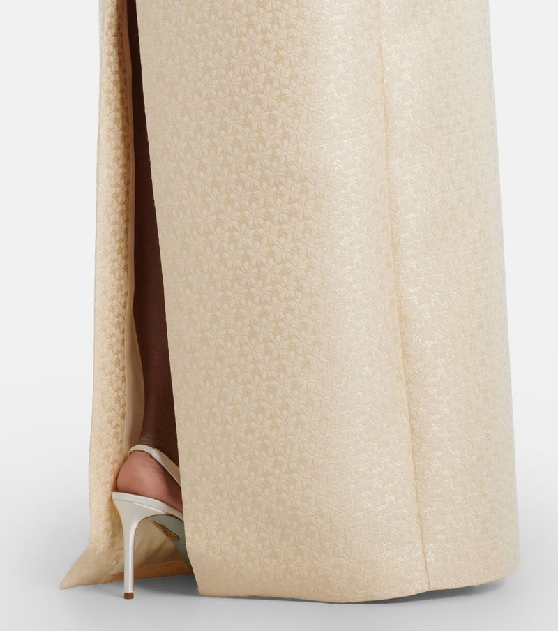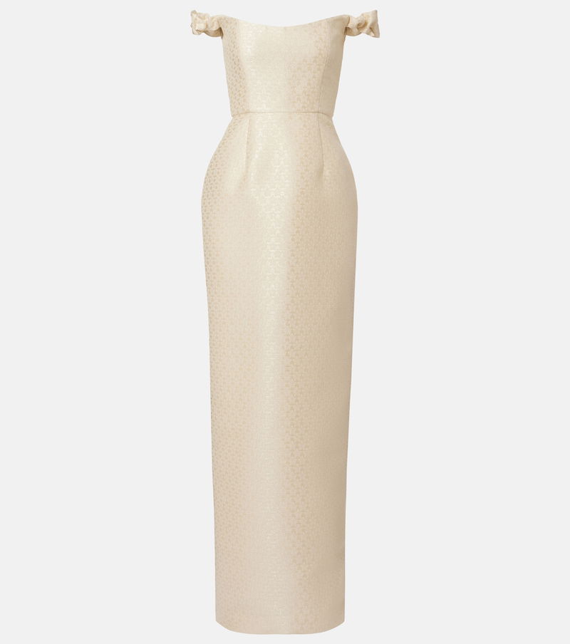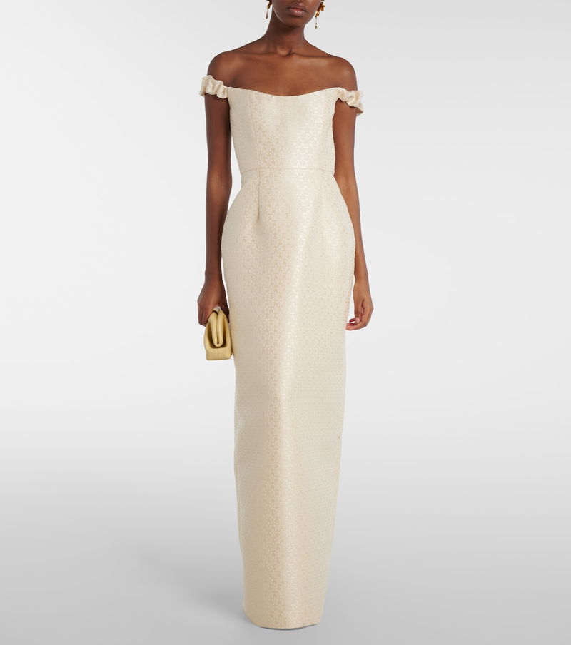 Markarian channels celestial glamour through couture-level silhouettes and a distinctly romantic perspective. The Yolanda bridal gown is a flattering off-shoulder design adorned with a brocade pattern, and its column silhouette has a floor length.