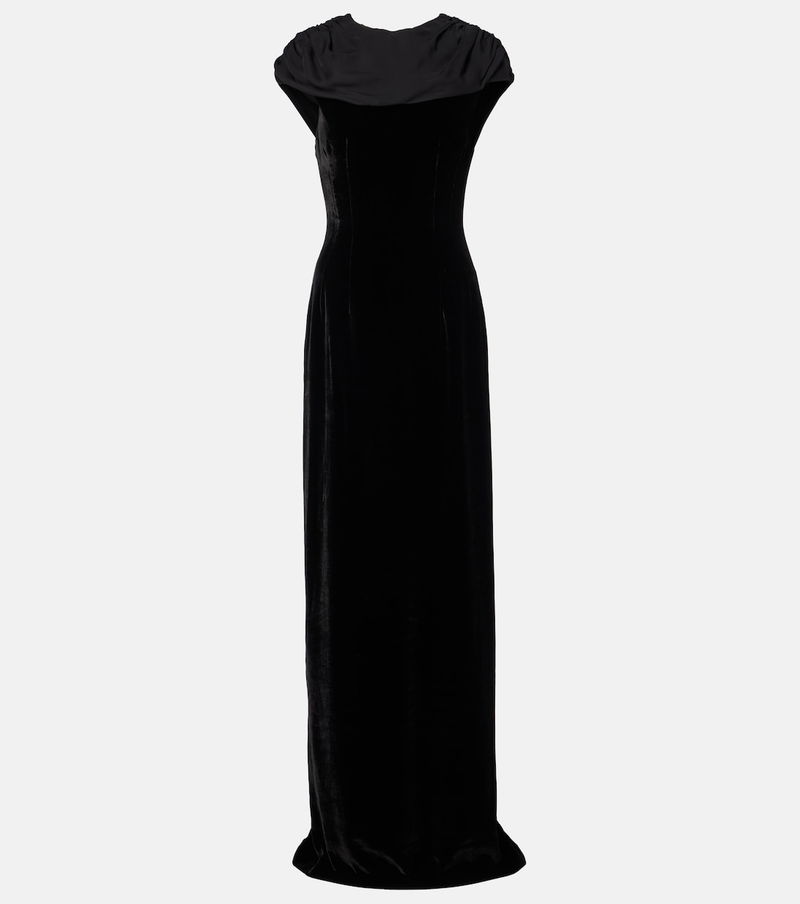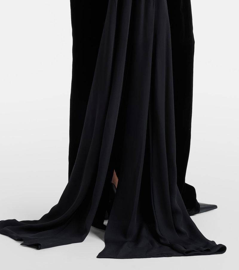 The Vesper gown from Markarian is a minimalist design finished with a theatrical silk georgette shawl and train. Falling to the floor length into a column silhouette, the elegant design is rendered in black.