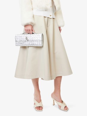 Silver mini clutch bag in good, pre-worn condition with gold hardware. See images for minor imperfections. Comes with original dust bag. Clasp closure, two main compartments, internal centre zip pocket, internal slip pocket.