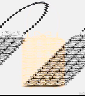 Hand-woven polypropylene basket tote in multicolor. Twin carry handles. Leather logo patch in black and white.