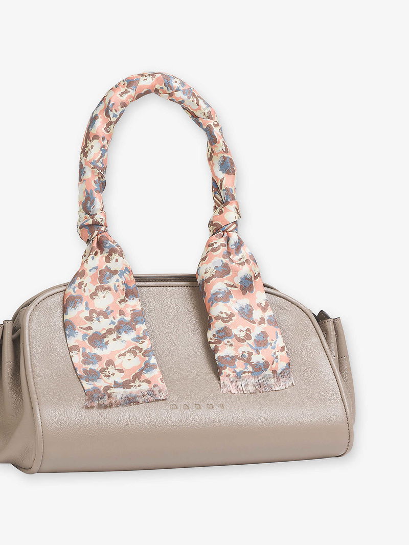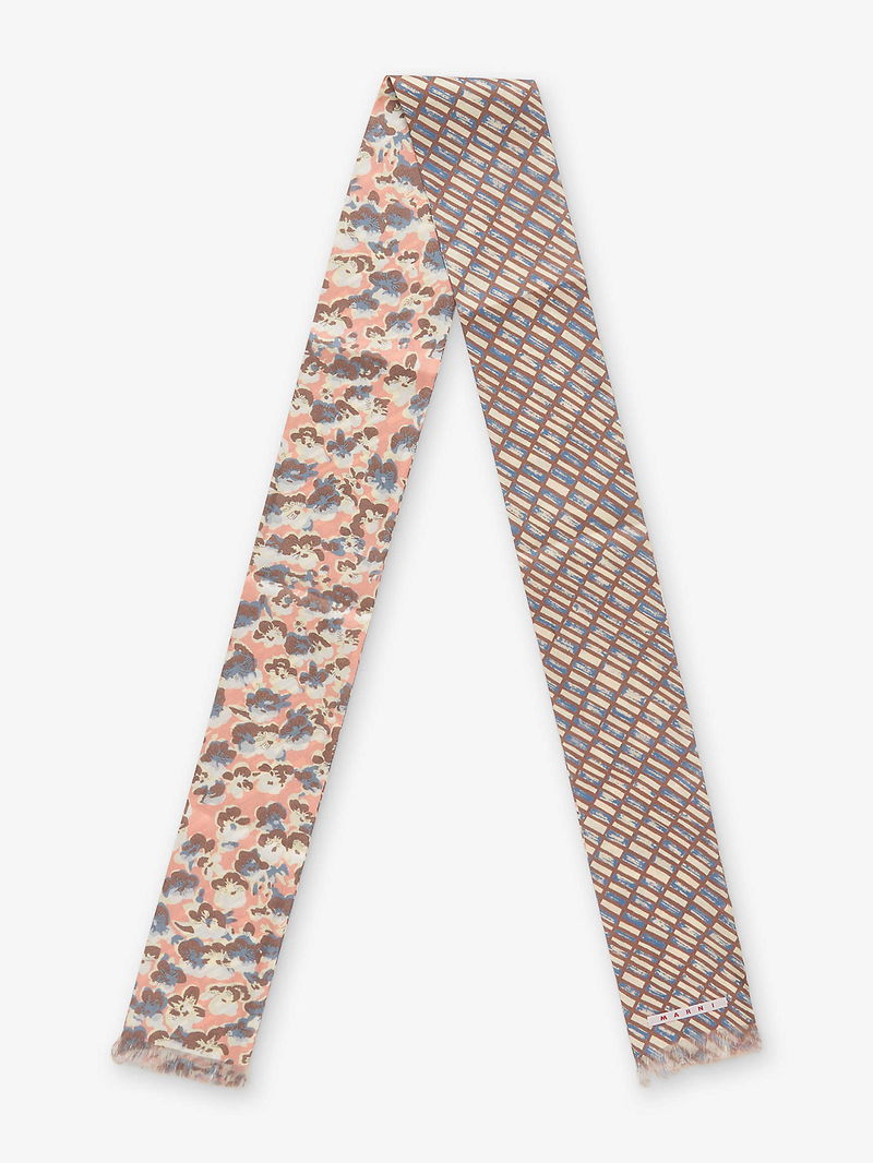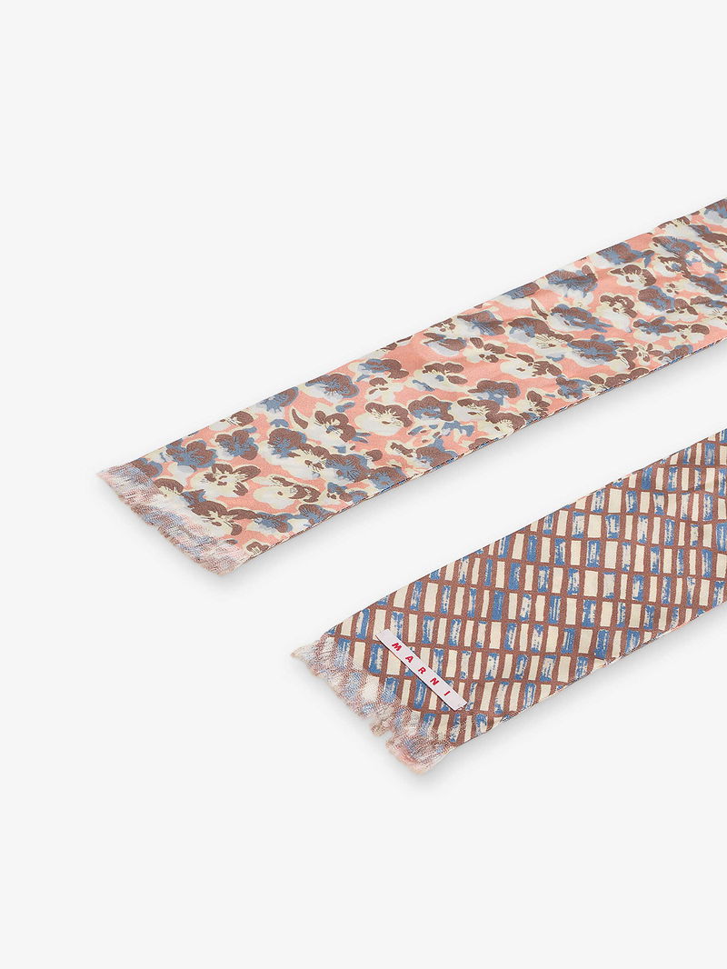 Marni silk scarf. Double-sided, micro-floral and Criss Cross pattern, frayed ends, embroidered Marni label.