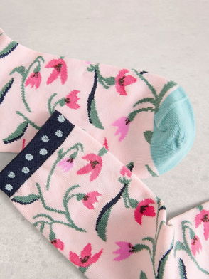 • Mid-calf length, Sprayed Roses intarsia design, brand intarsia at cuff, colour-block sole