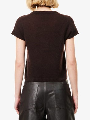 Brown stretchy cotton in excellent, pre-loved condition. With long sleeve top, form fitting, wide collar and boat neck.