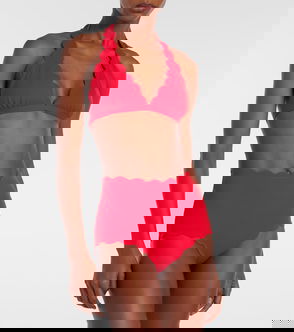 The Chesapeake bikini top from Marysia is anchored with a halterneck that's threaded through at the front of the bust. It's made from textured swim jersey with brand-typical scalloped edges.