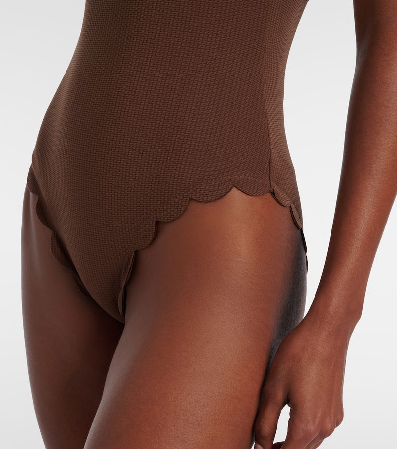 Marysia's signature Palm Springs swimsuit is rendered in brown with a low-back silhouette. The style is complete with the label's signature hand-cut scalloped edges along the neckline and legs.