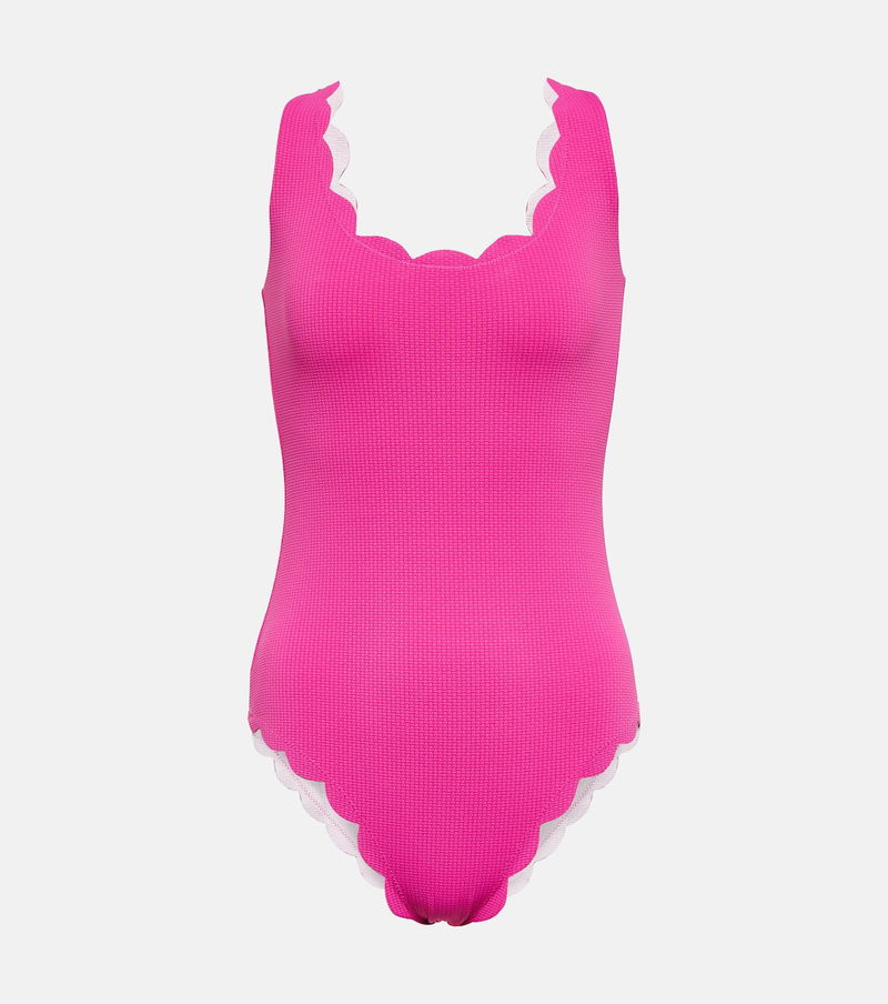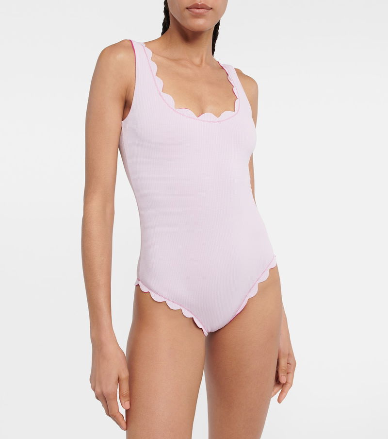 Marysia’s most recognizable feature is the hand-cut scalloped edges that do without stitching or elastic for a more flattering fit. This round-neck swimsuit has a waffled texture and offers moderate coverage.