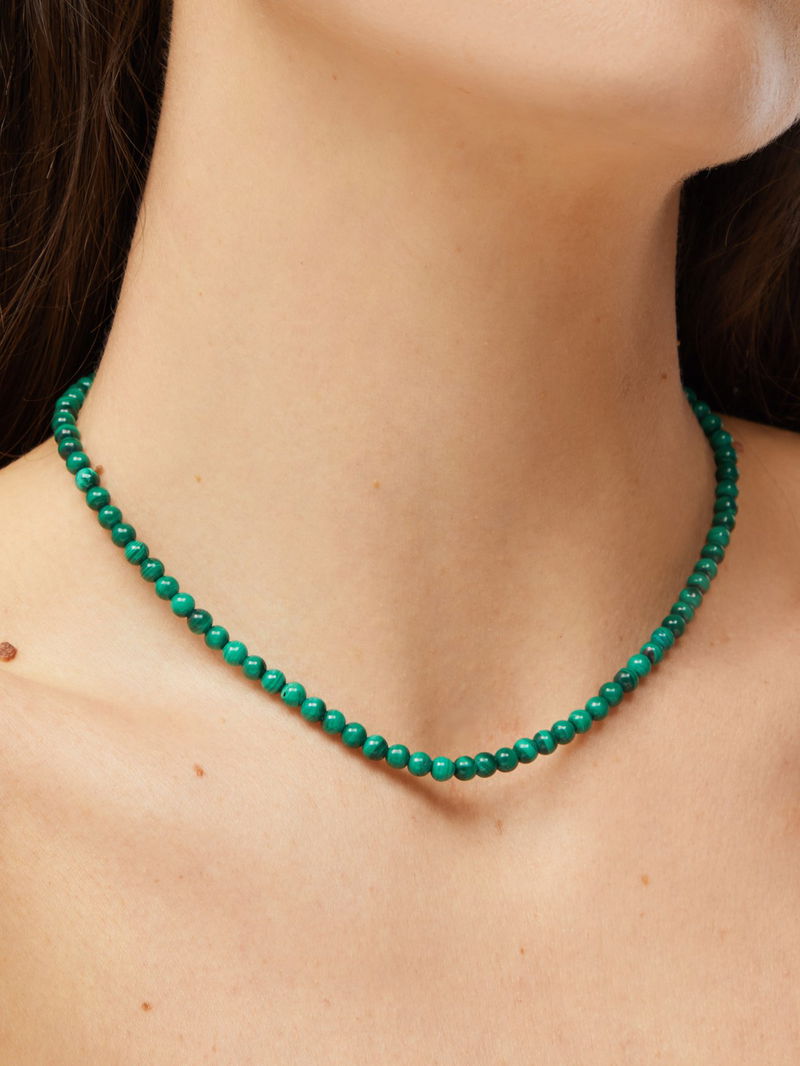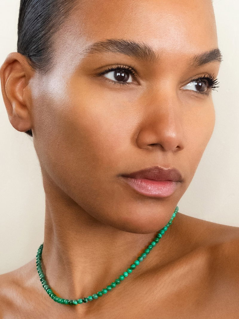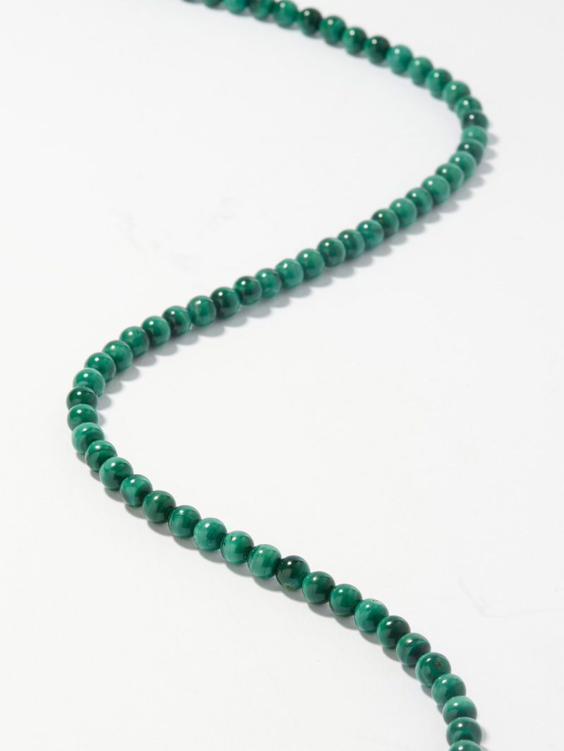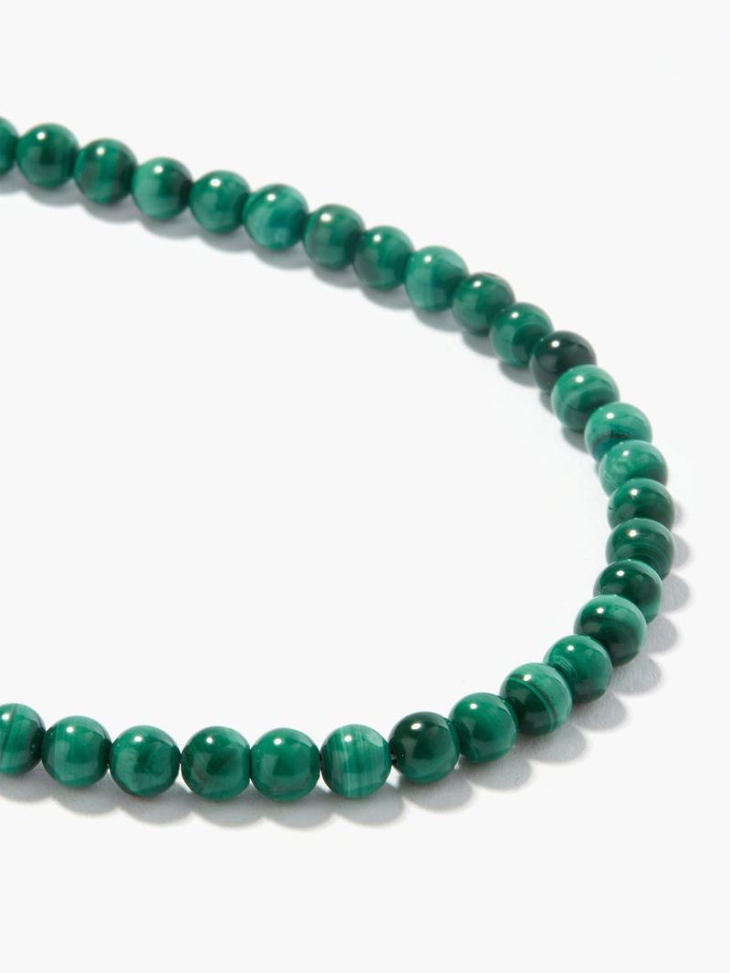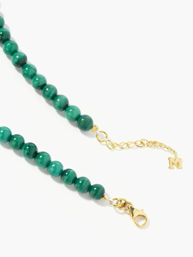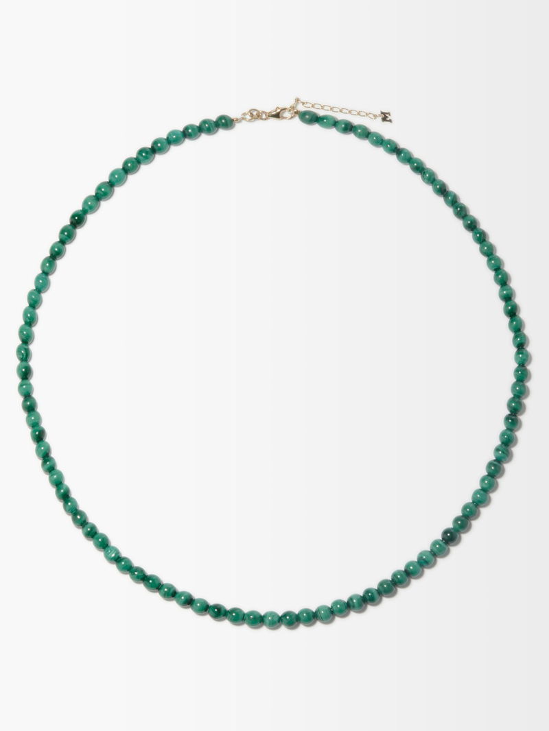 Mateo’s elegant necklace is strung with beaded malachite cabochons, a marbled green healing stone thought to bring balance and calming qualities to the wearer. It’s handcrafted at the label’s New York atelier from 14kt gold with an adjustable chain and lobster-clasp fastening.