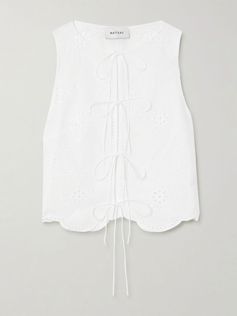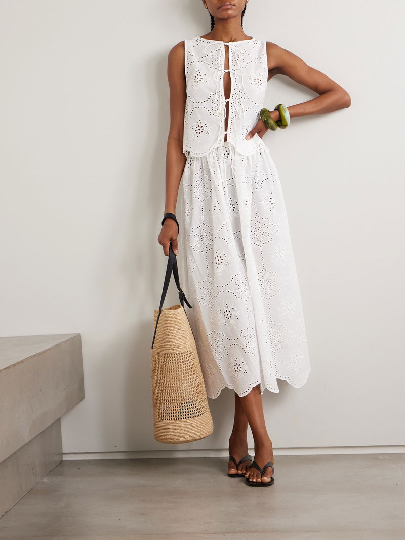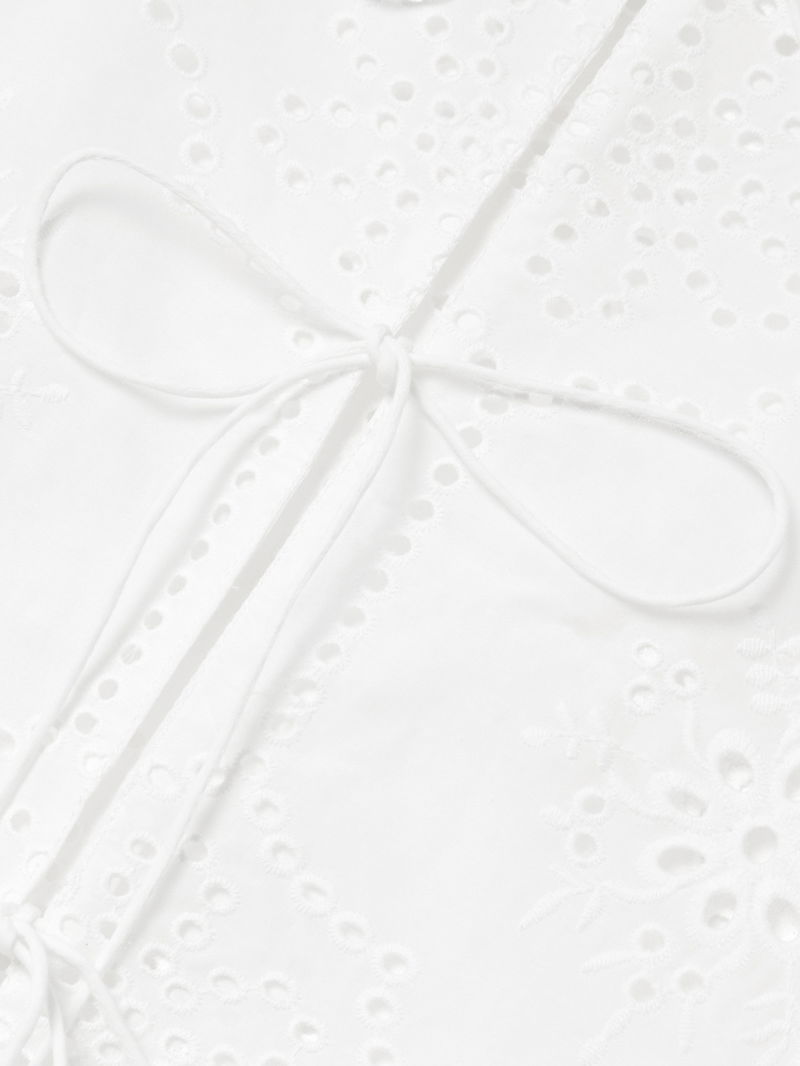 Matteau's top makes the perfect summery set with the matching skirt in our edit. Cut from broderie anglaise cotton, it has a scalloped hem and open front that fastens with slim ties. Underpin yours with a bralette to temper the sheerness.