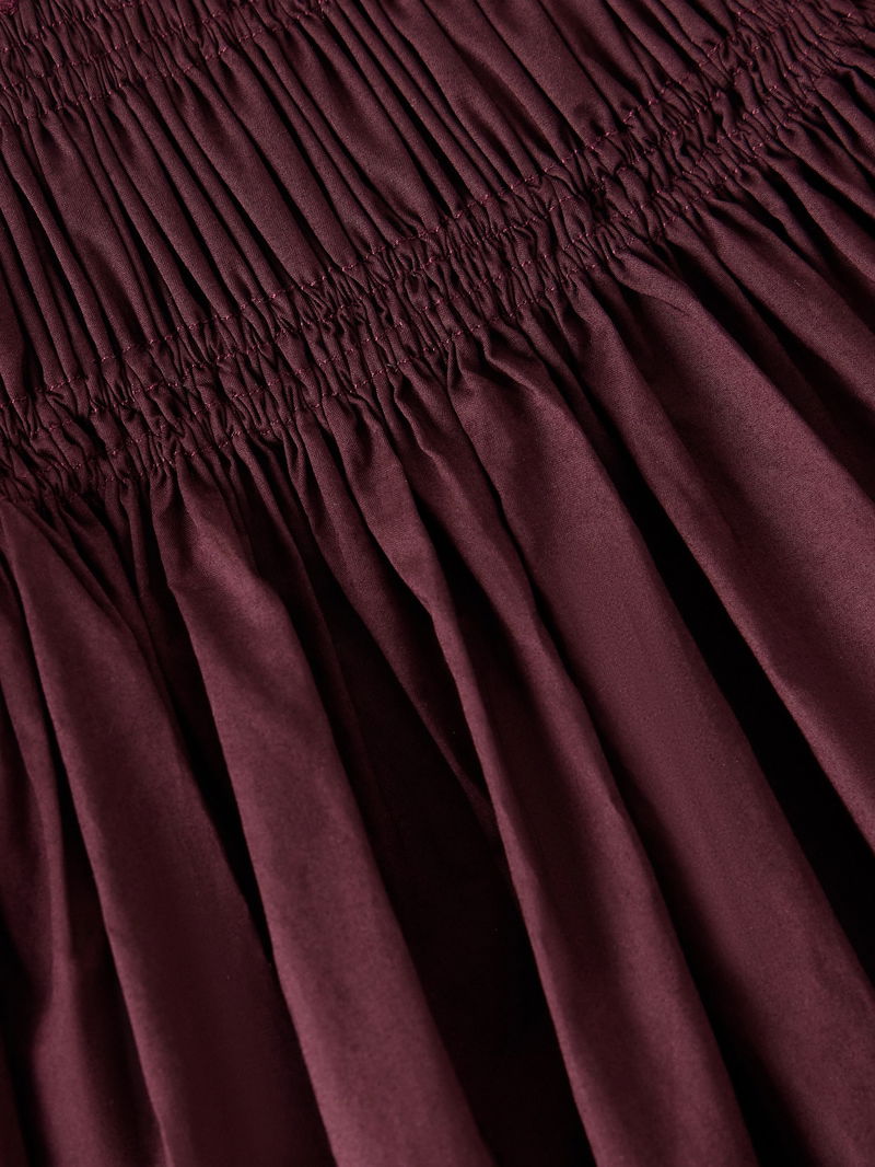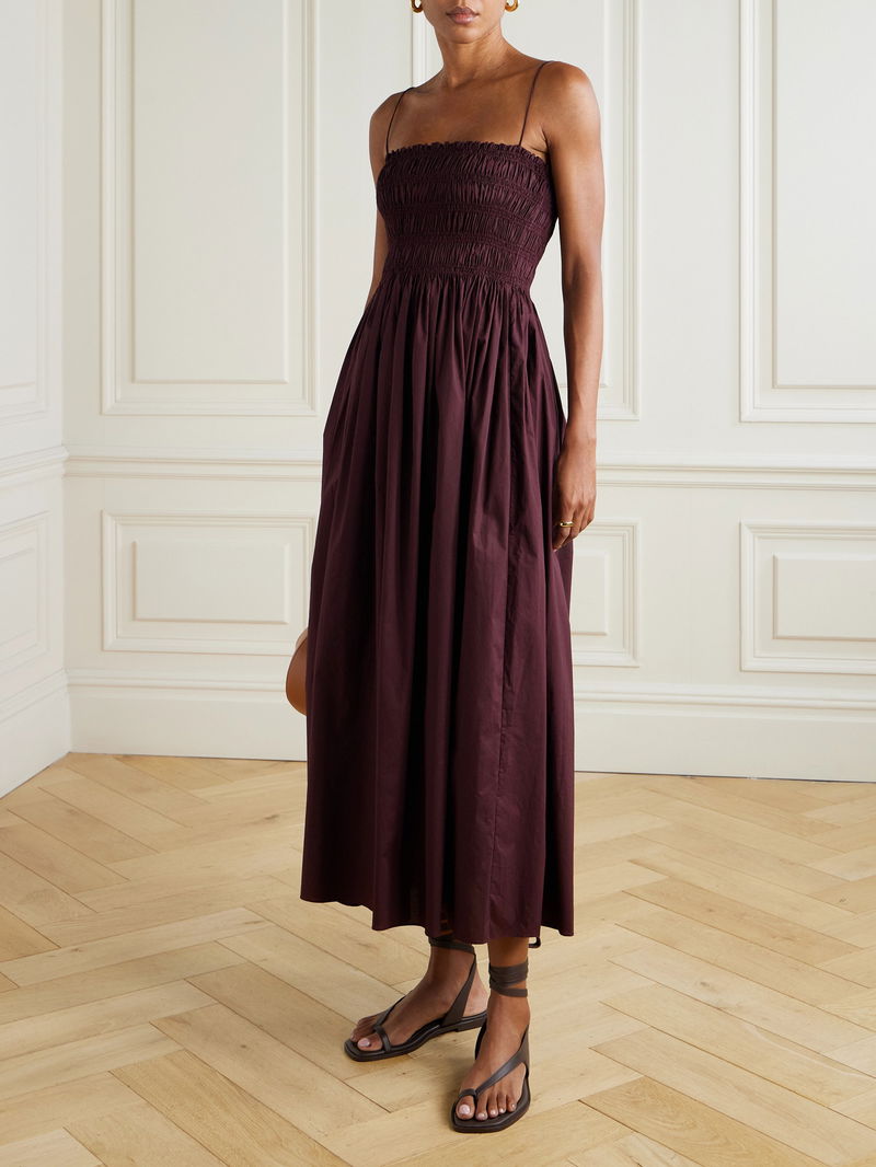 Matteau's midi dress is perfect for warm-weather days when you want to feel cool and look put together. Made from organic cotton, it has a floaty skirt and shirred bodice framed by delicate straps. Complement the burgundy hue with neutral accessories.