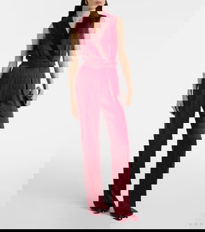 The Fiero jumpsuit features a draped bodice, supported by internal boning, and sashes fastened at the waist by a metal buckle.