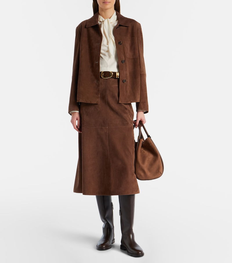 The Marine Small tote bag by Max Mara is characterized by tubular top handles that wrap the capacious silhouette. This brown suede style has a removable shoulder strap for versatile styling, purse feet, and foiled lettering.