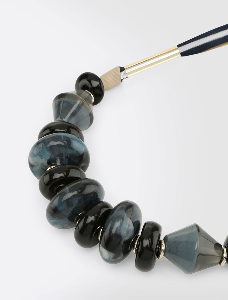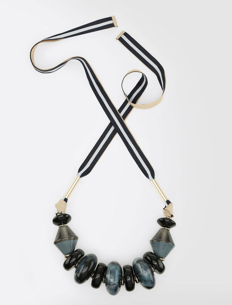 Choker necklace with marble-effect resin accents. Fastens with grosgrain ribbons.