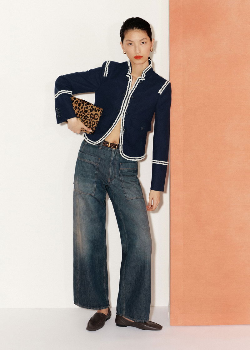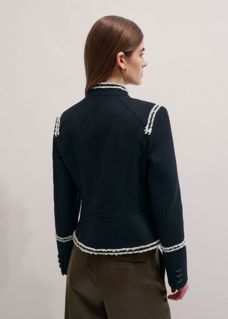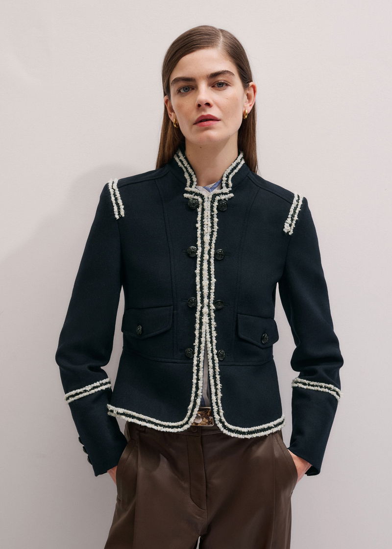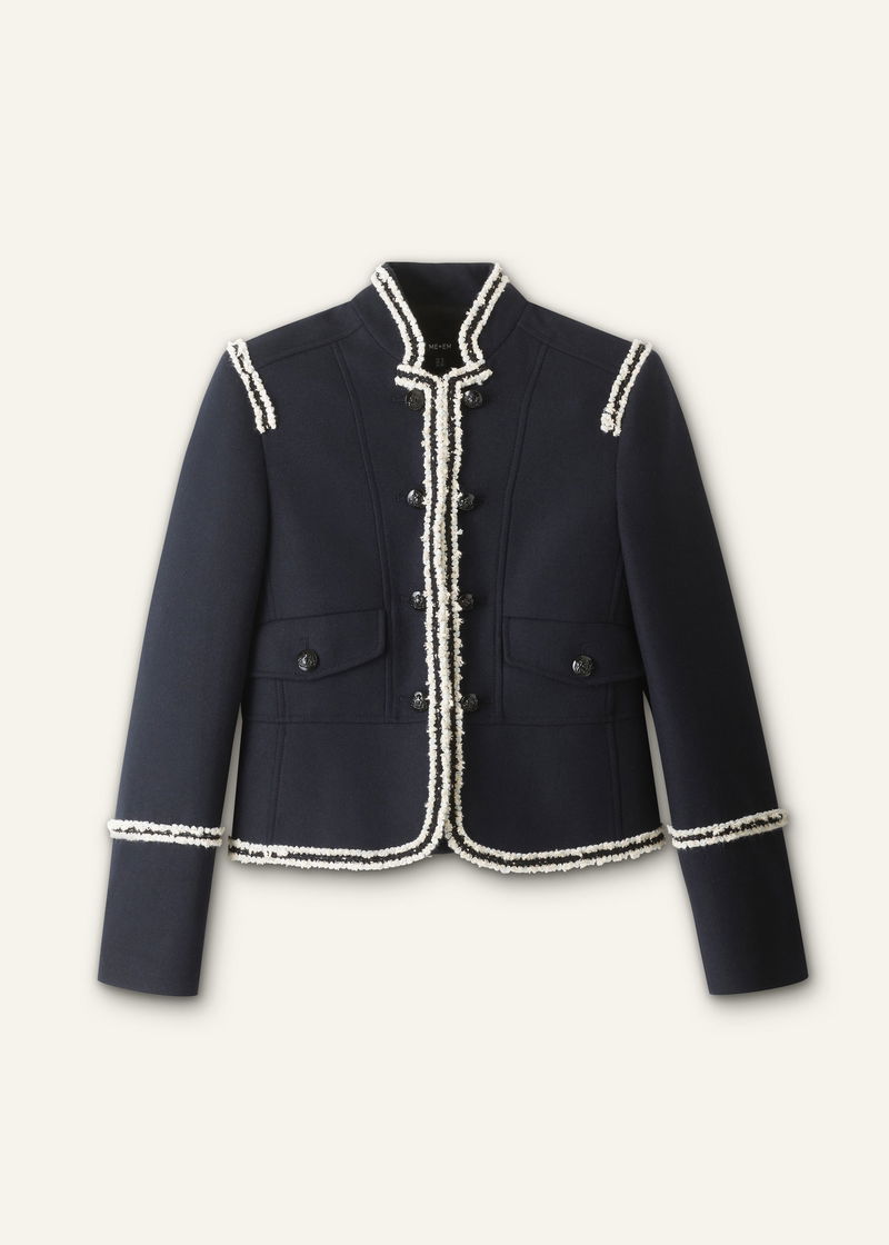 ME+EM's Navy Bold Braid Short Fitted Jacket is crafted from an Italian wool fabric with a brushed texture.