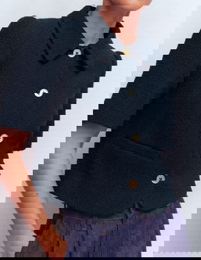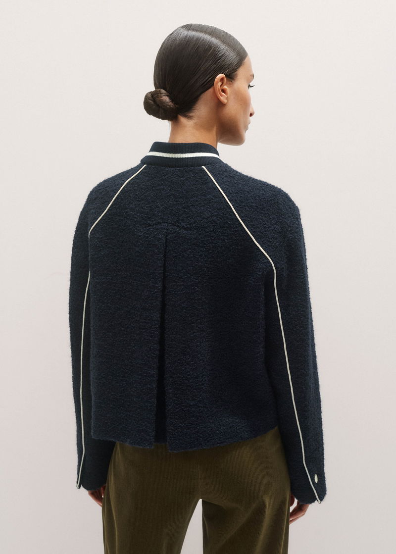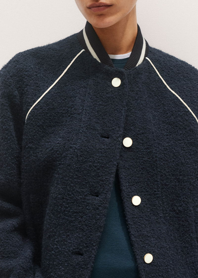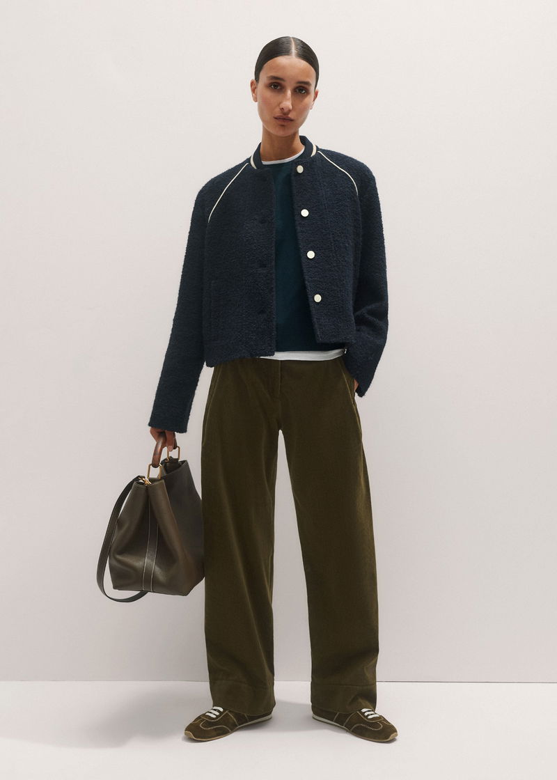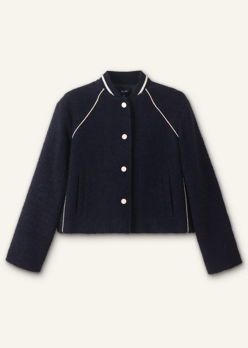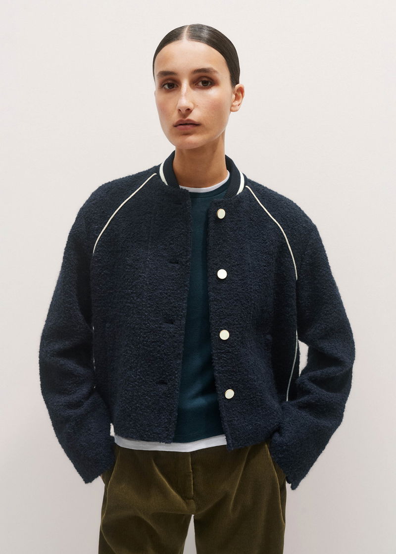 ME+EM's Navy Bouclé Varsity Swing Jacket is crafted from an Italian bouclé with both wool and alpaca fibres.