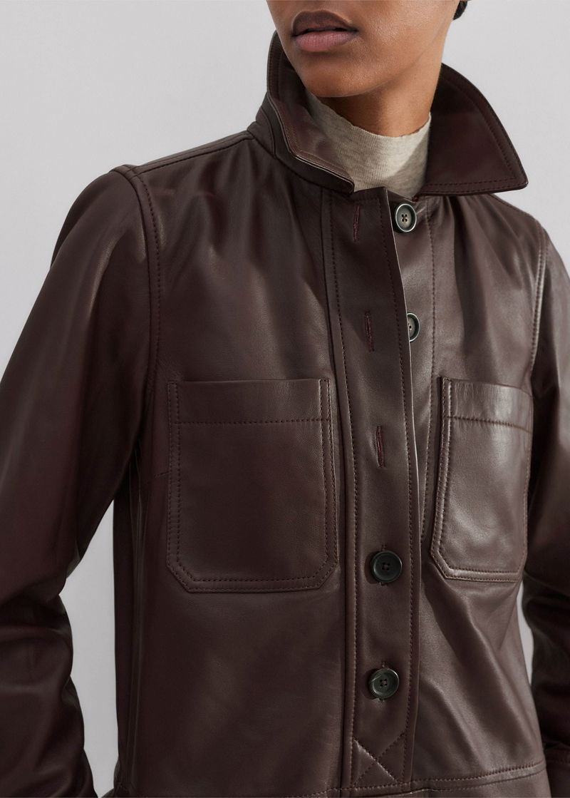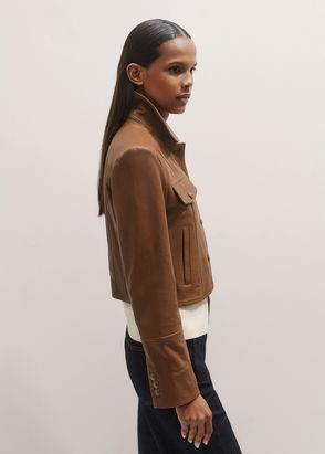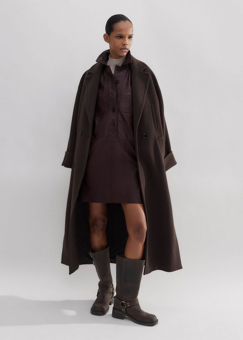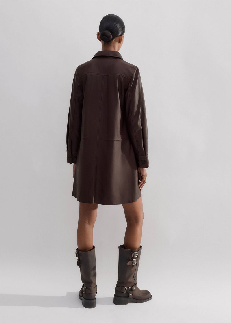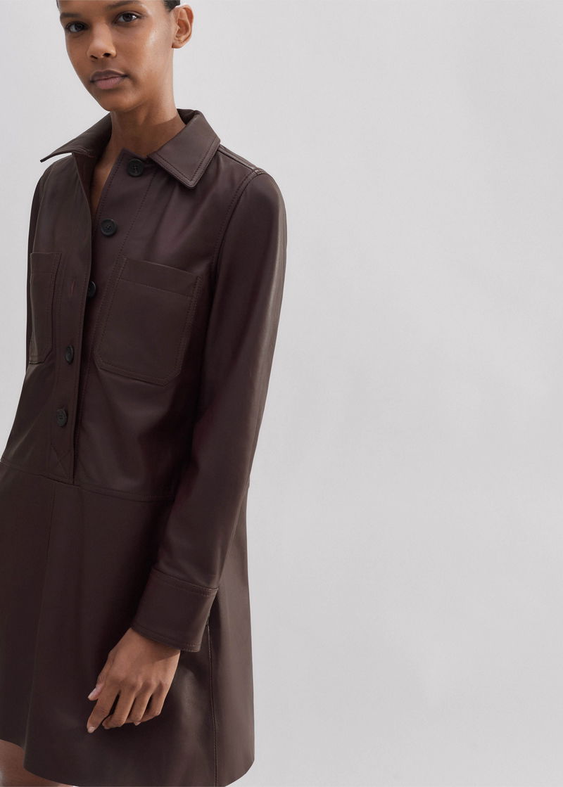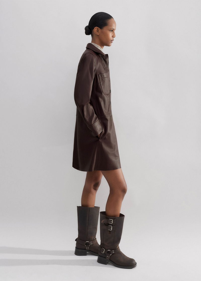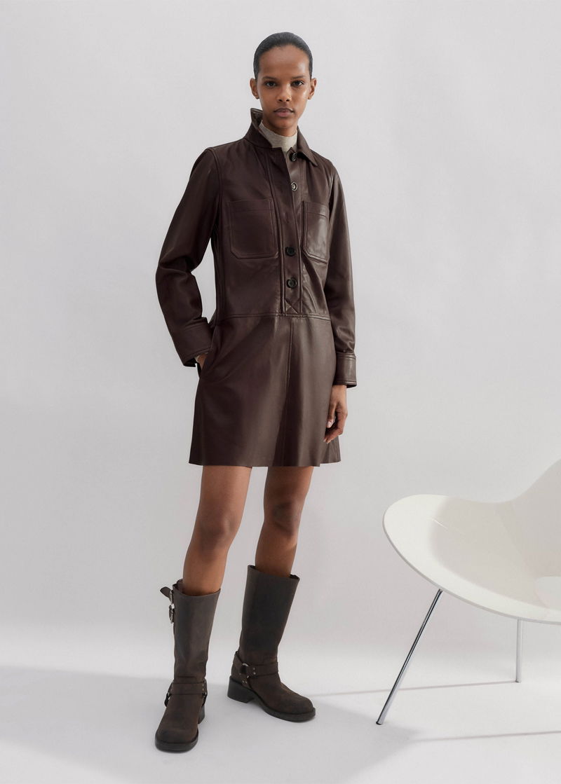 ME+EM's Brown Butter Soft Leather Short Shift Dress keeps autumn temperatures in mind whilst the mini length is ideal for styling with tall boots.