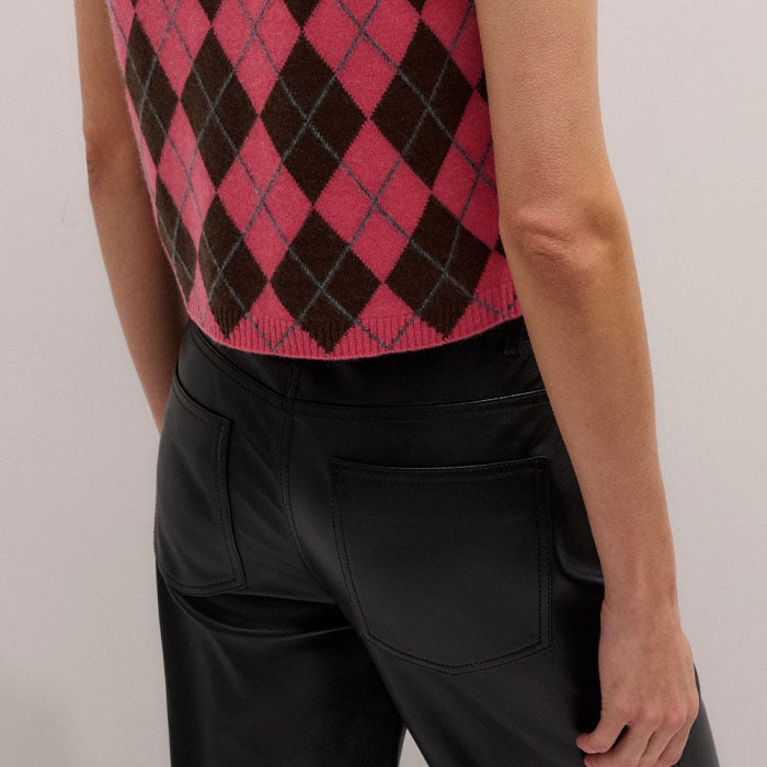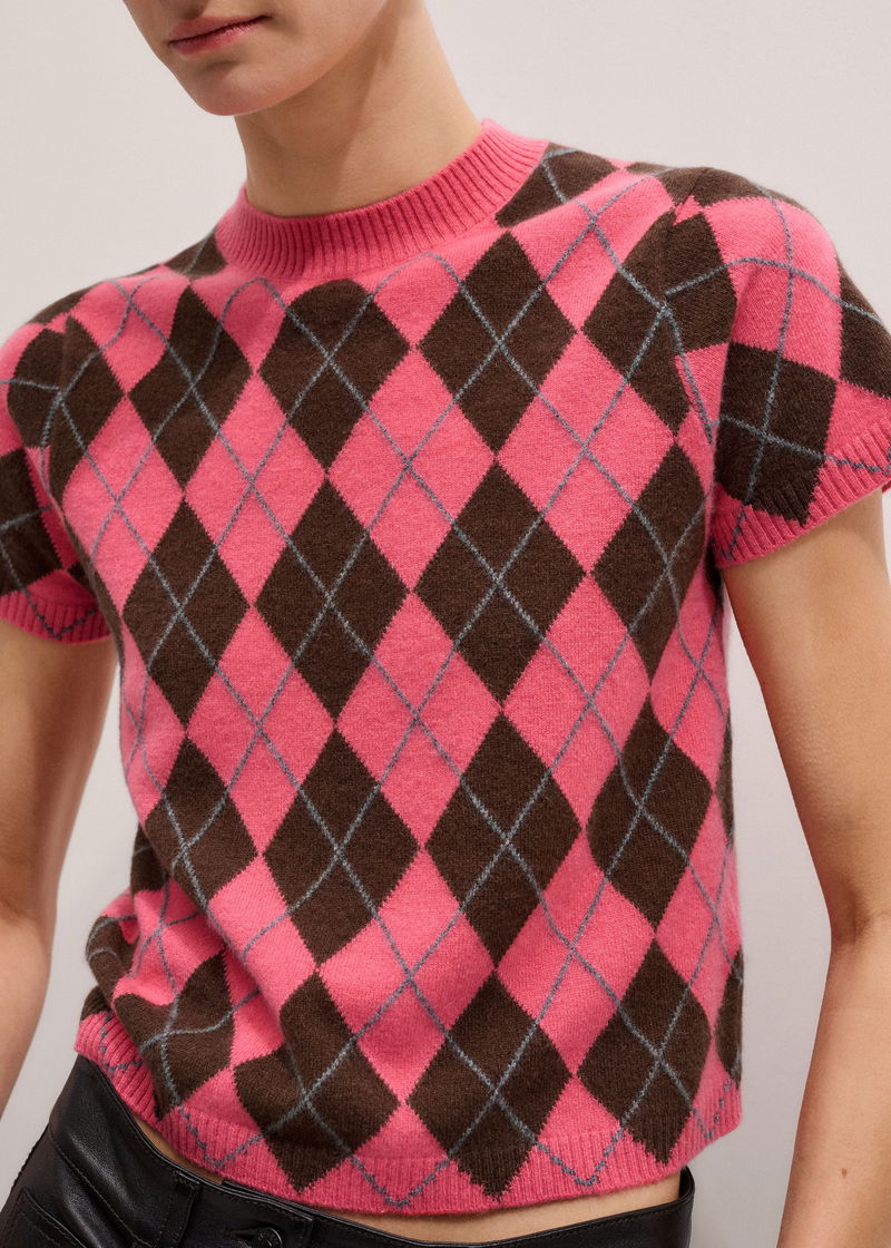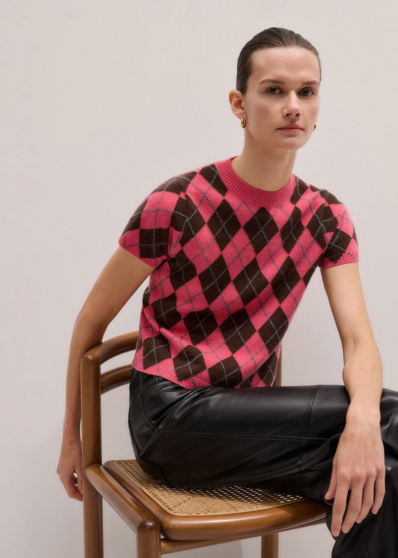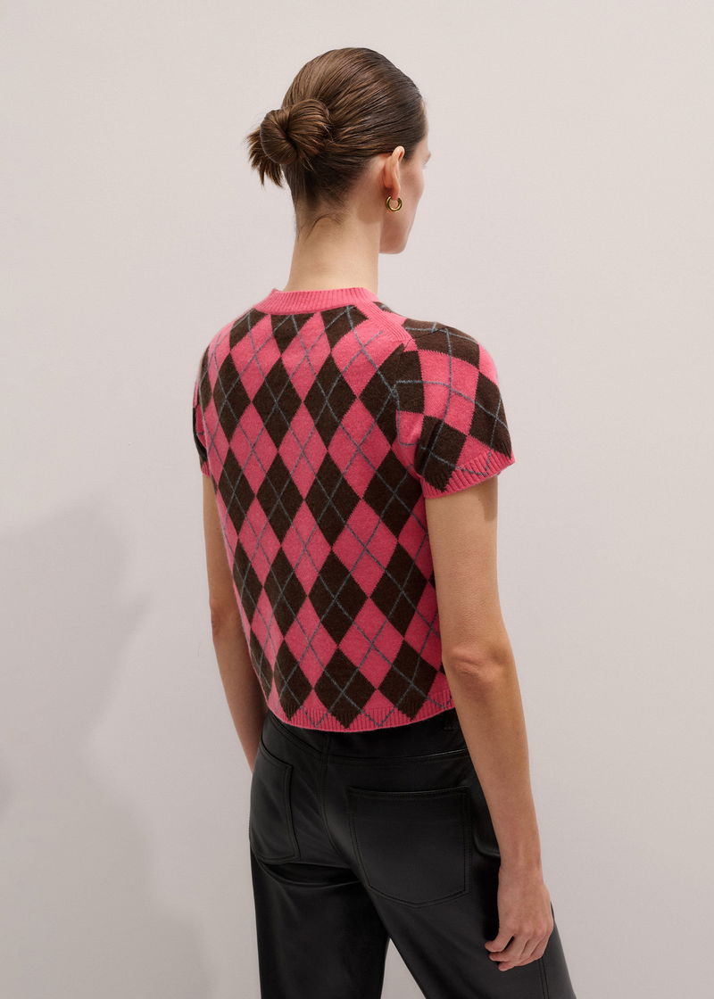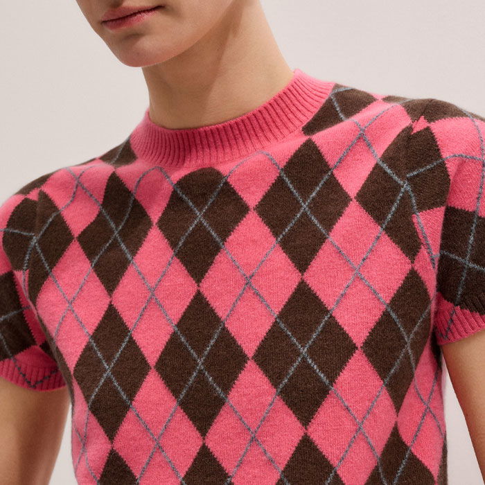 Cashmere Argyle Knit Baby Tee Rhubarb Pink/Chestnut Brown/Grey Melange