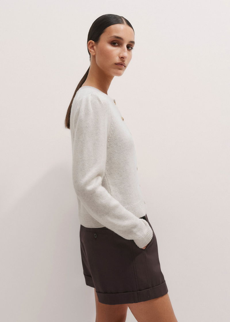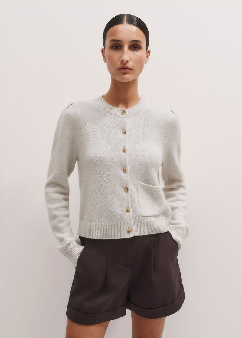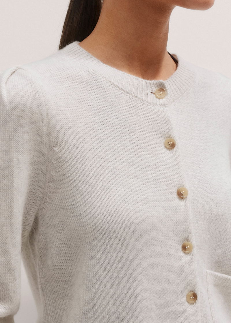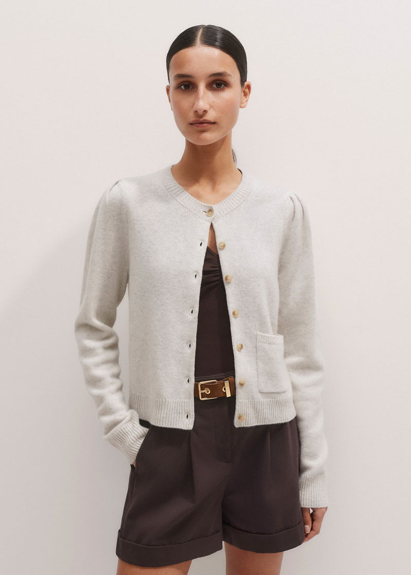 ME+EM's Grey Cashmere Pouf Sleeve Cardigan is elevated with a pouf at the shoulder for flattering shape and ribbed trims.