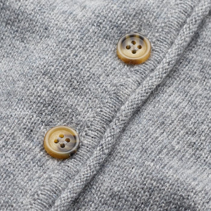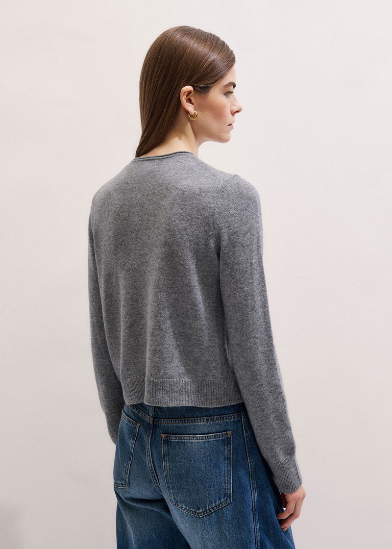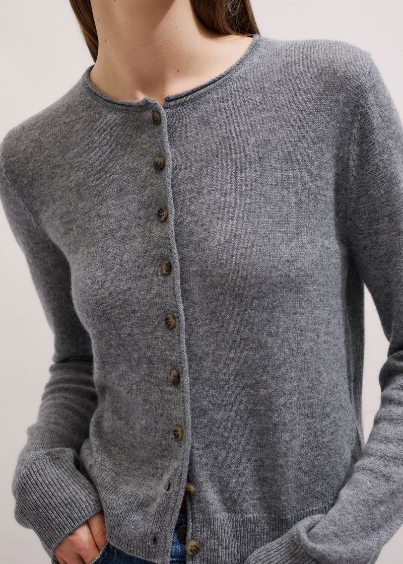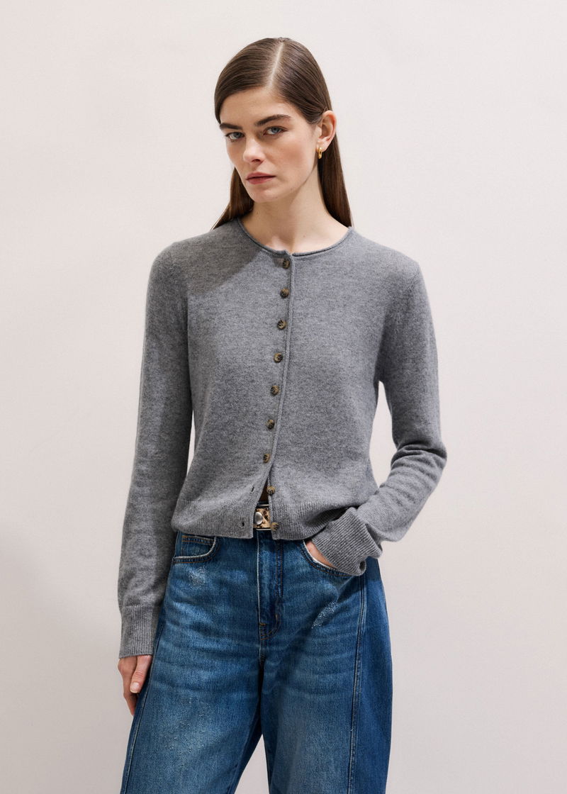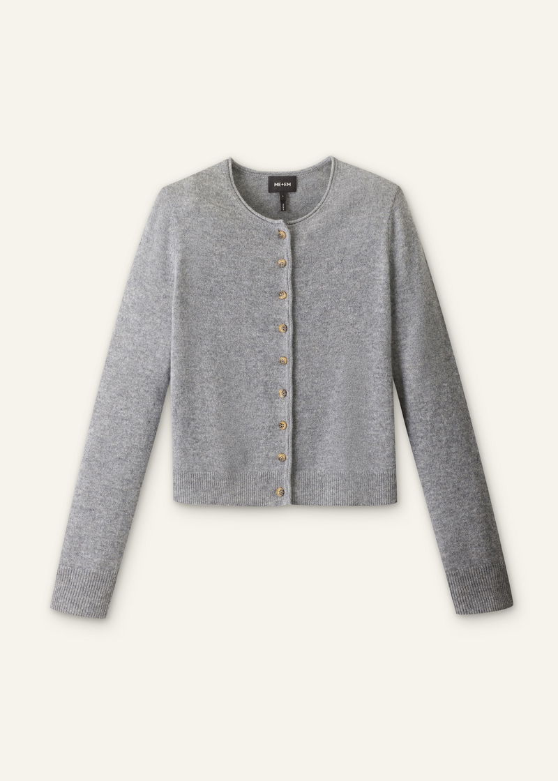 ME+EM's Grey Cashmere Roll Trim Straight Cardigan is elevated by a rolled collar and a button-down placket for added dimension.