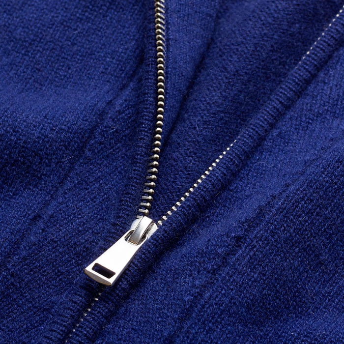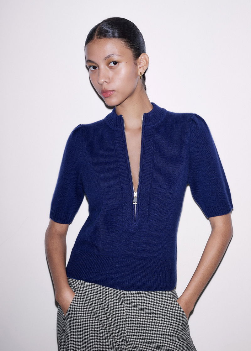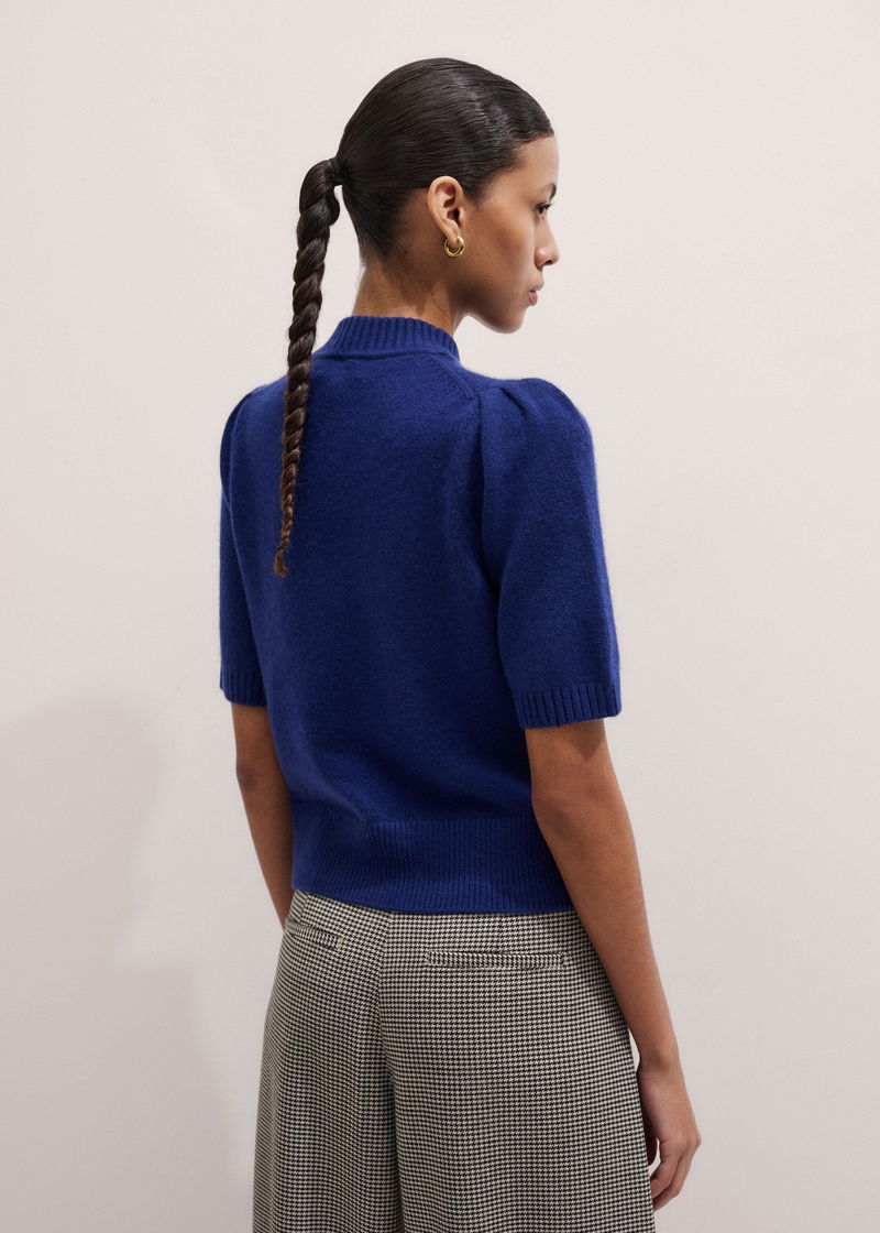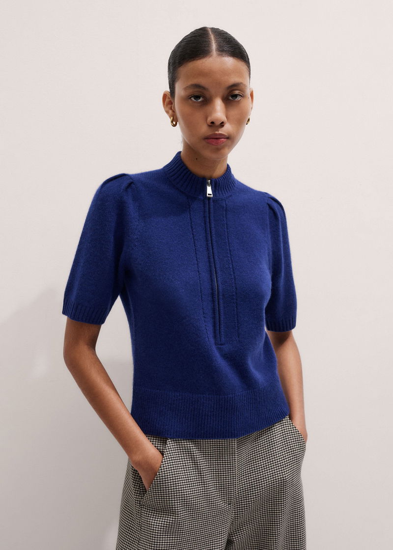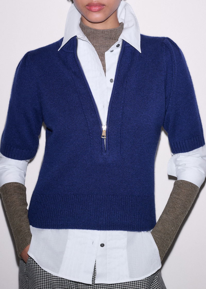 Cashmere Zip Neck Pouf Sleeve Knit Tee Jewel Blue