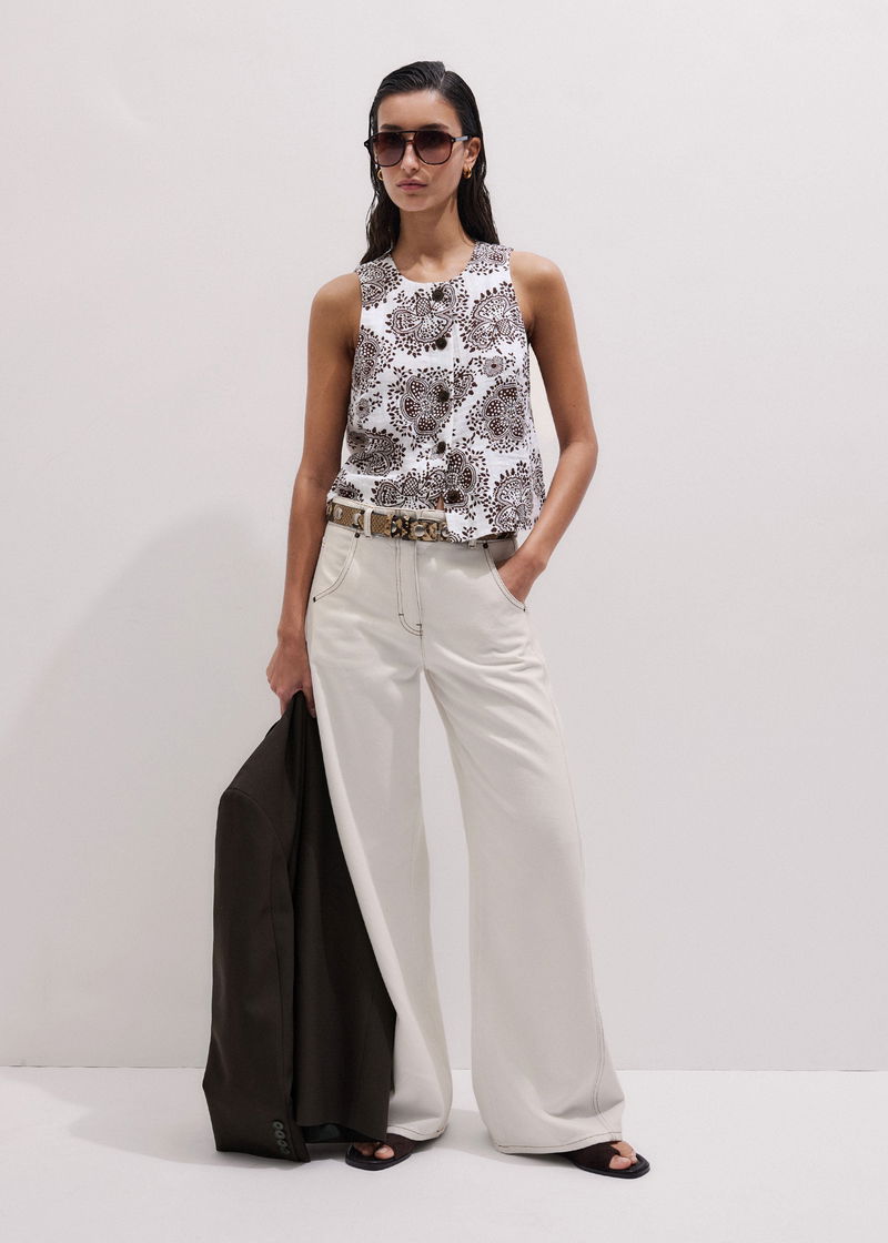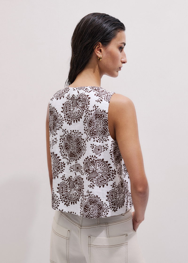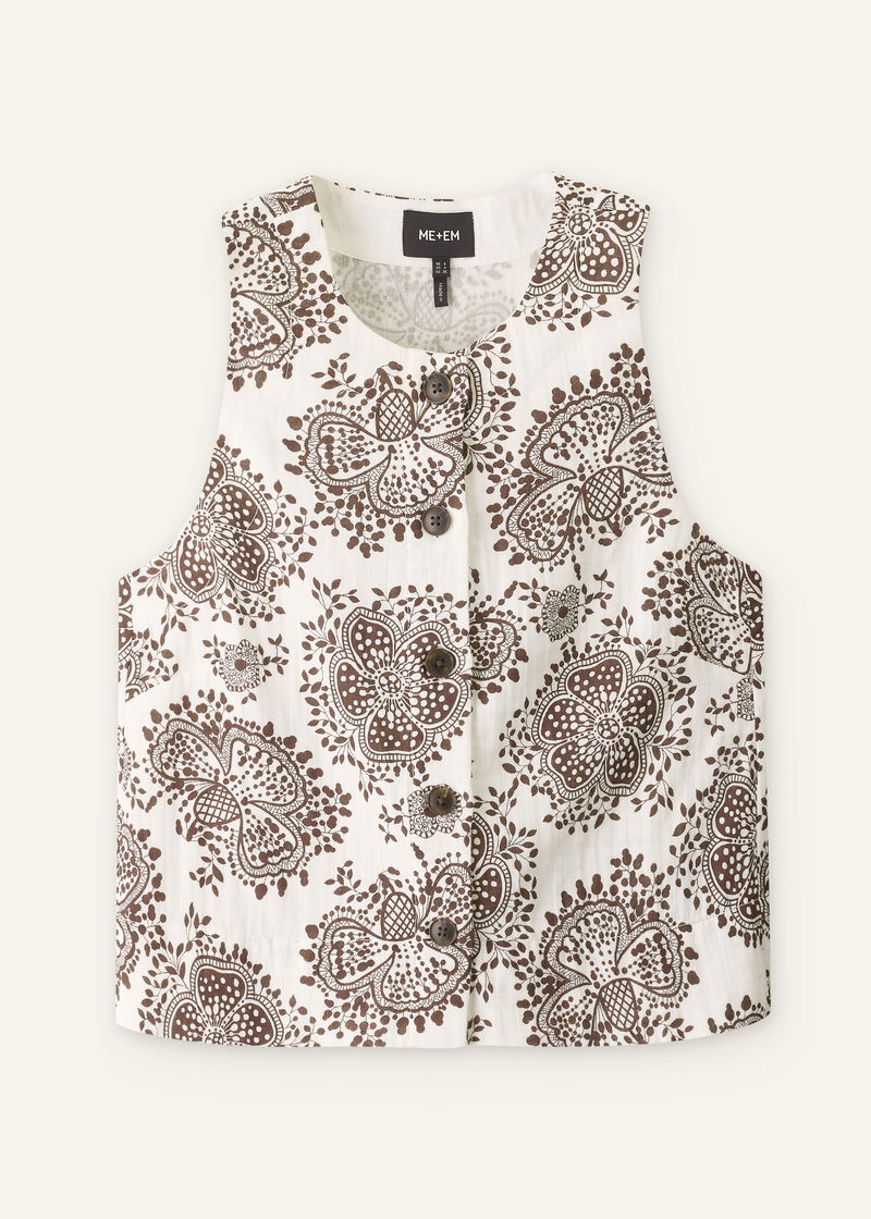 ME+EM's White Cheesecloth Full Bloom Print Short Straight Top is crafted from naturally textured cheesecloth, making it the perfect addition to your holiday suitcase.