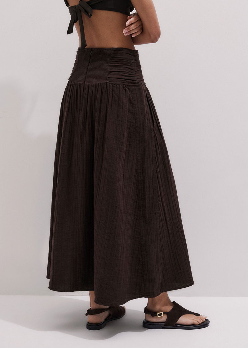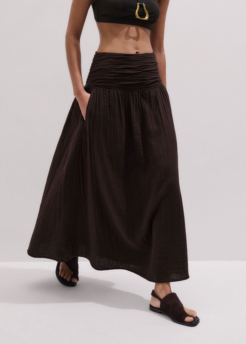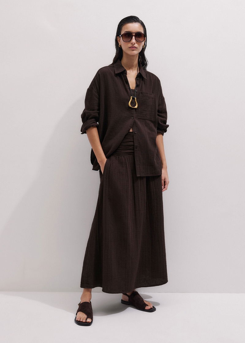 ME+EM's Brown Cheesecloth Relaxed Maxi Skirt is crafted from cotton cheesecloth for a lightweight, breathable finish.