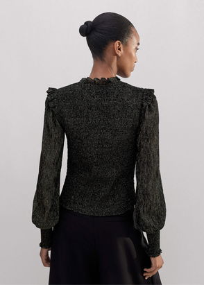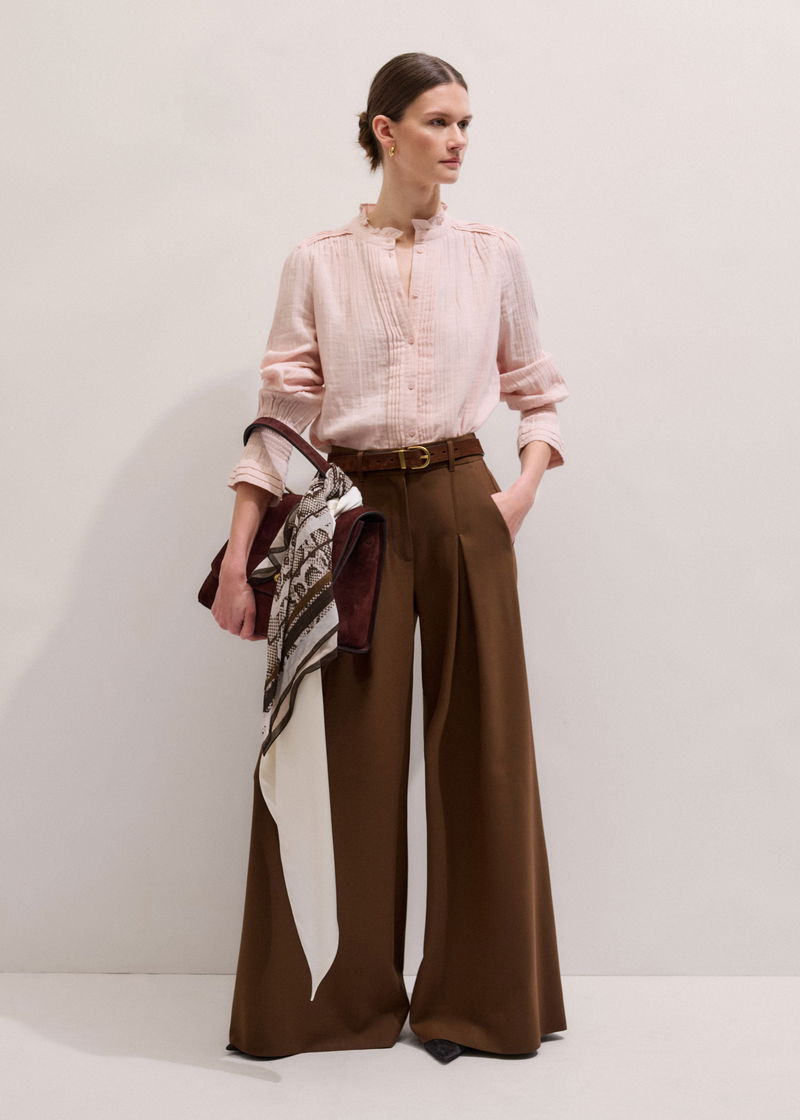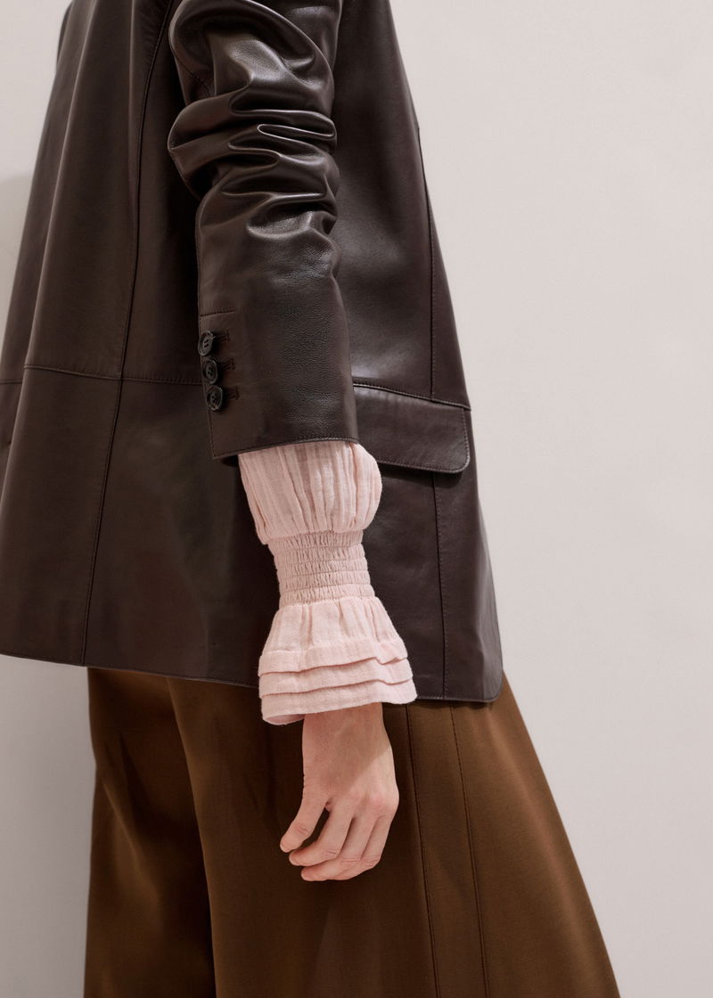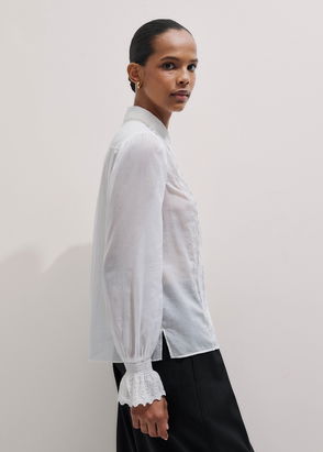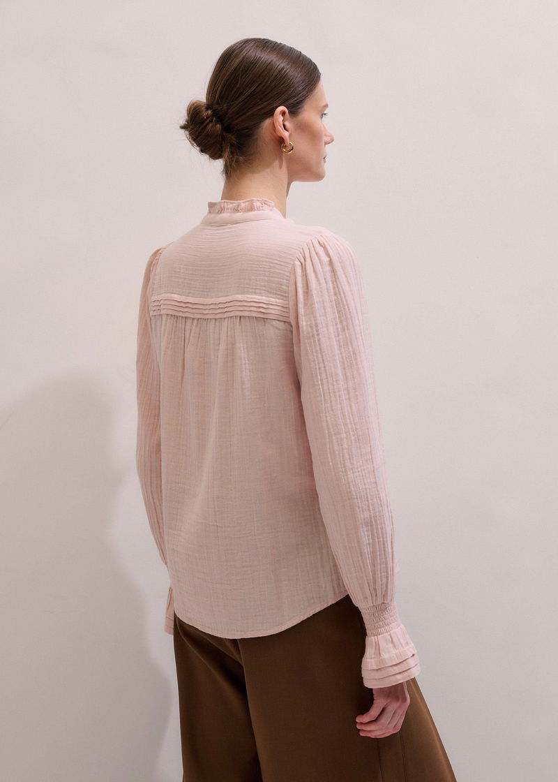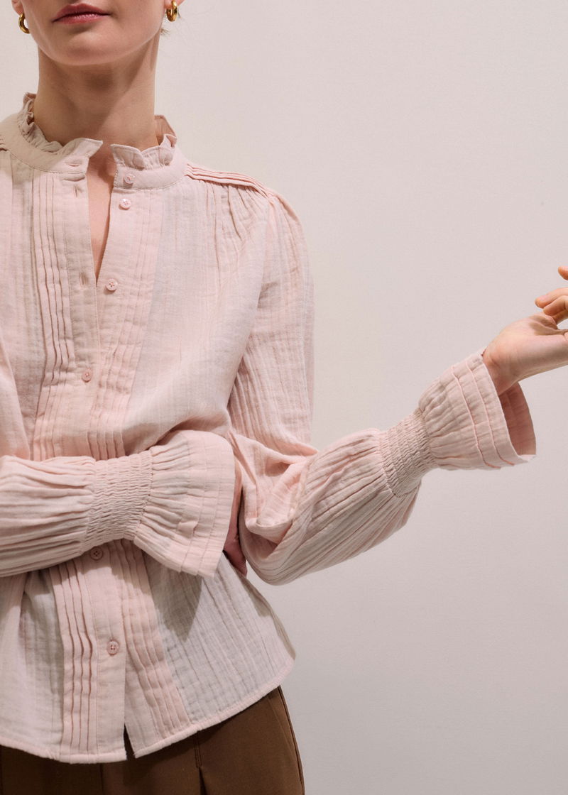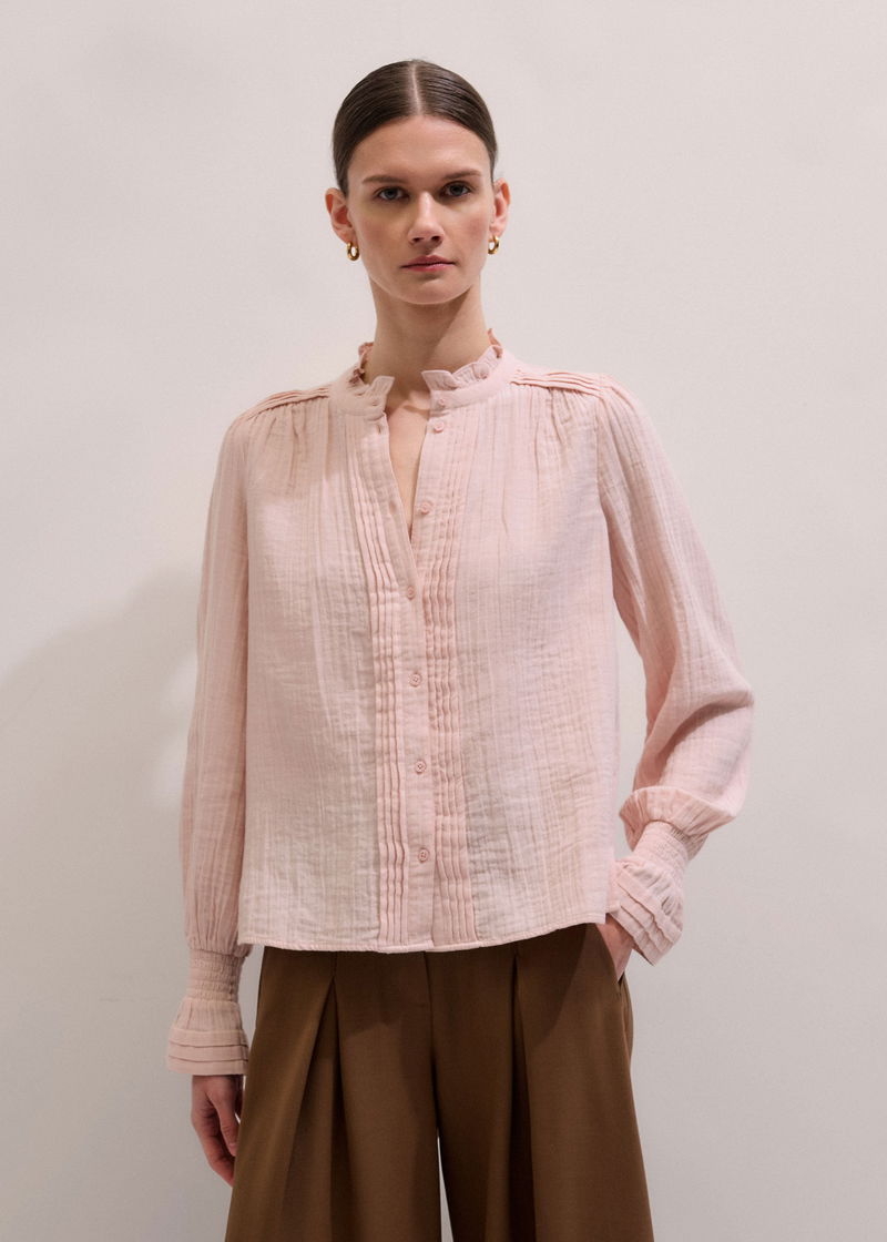 ME+EM's Pink Pleat Detail Long Sleeve Cheesecloth Blouse falls to a straight length with pleating at the placket, shoulders and cuffs.