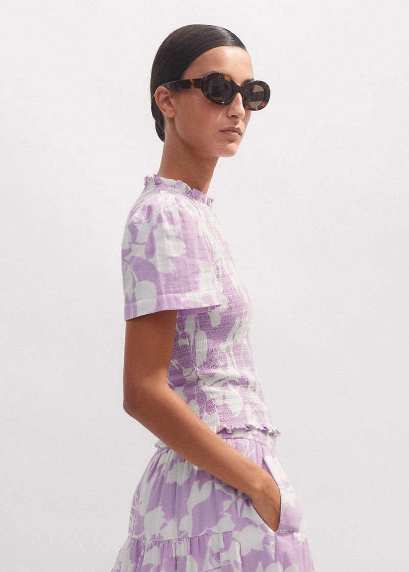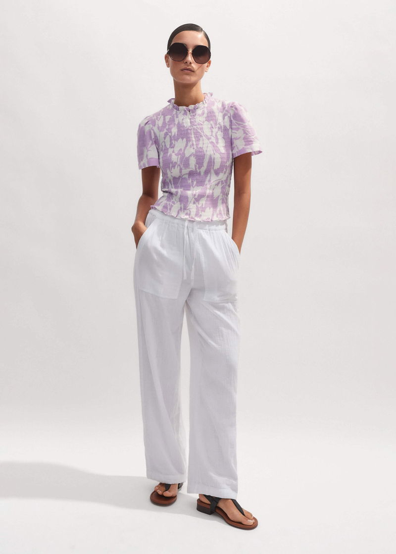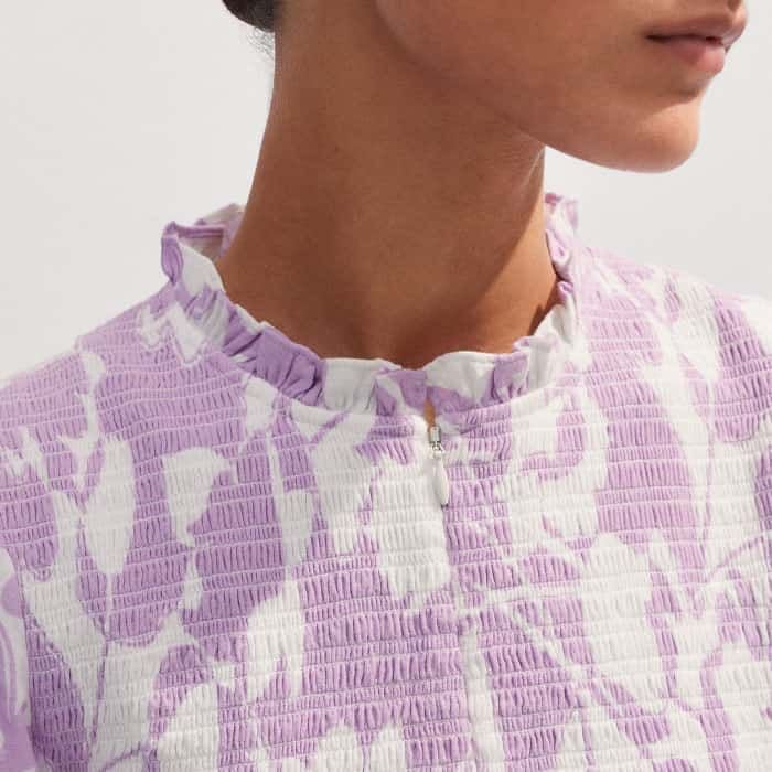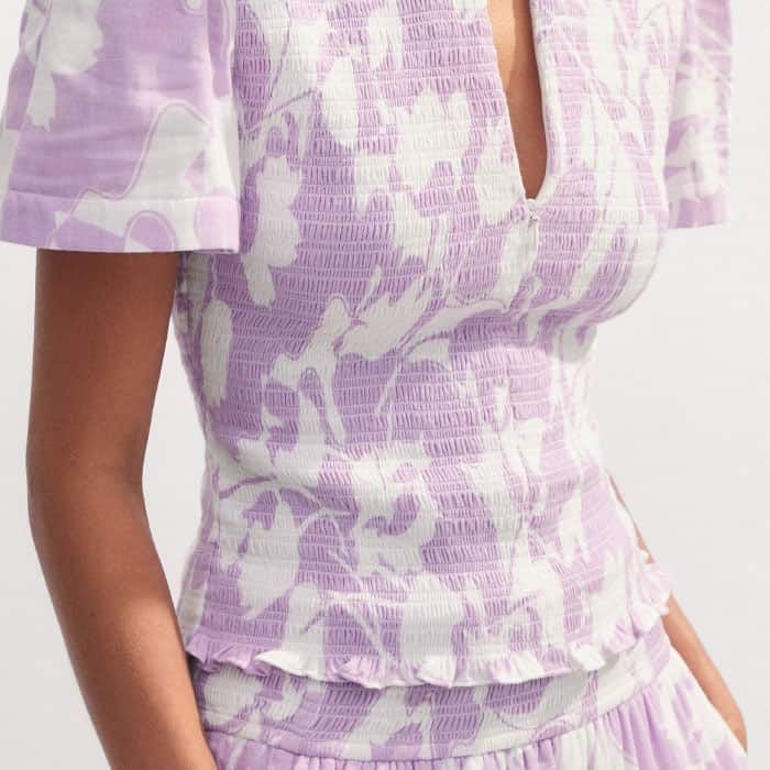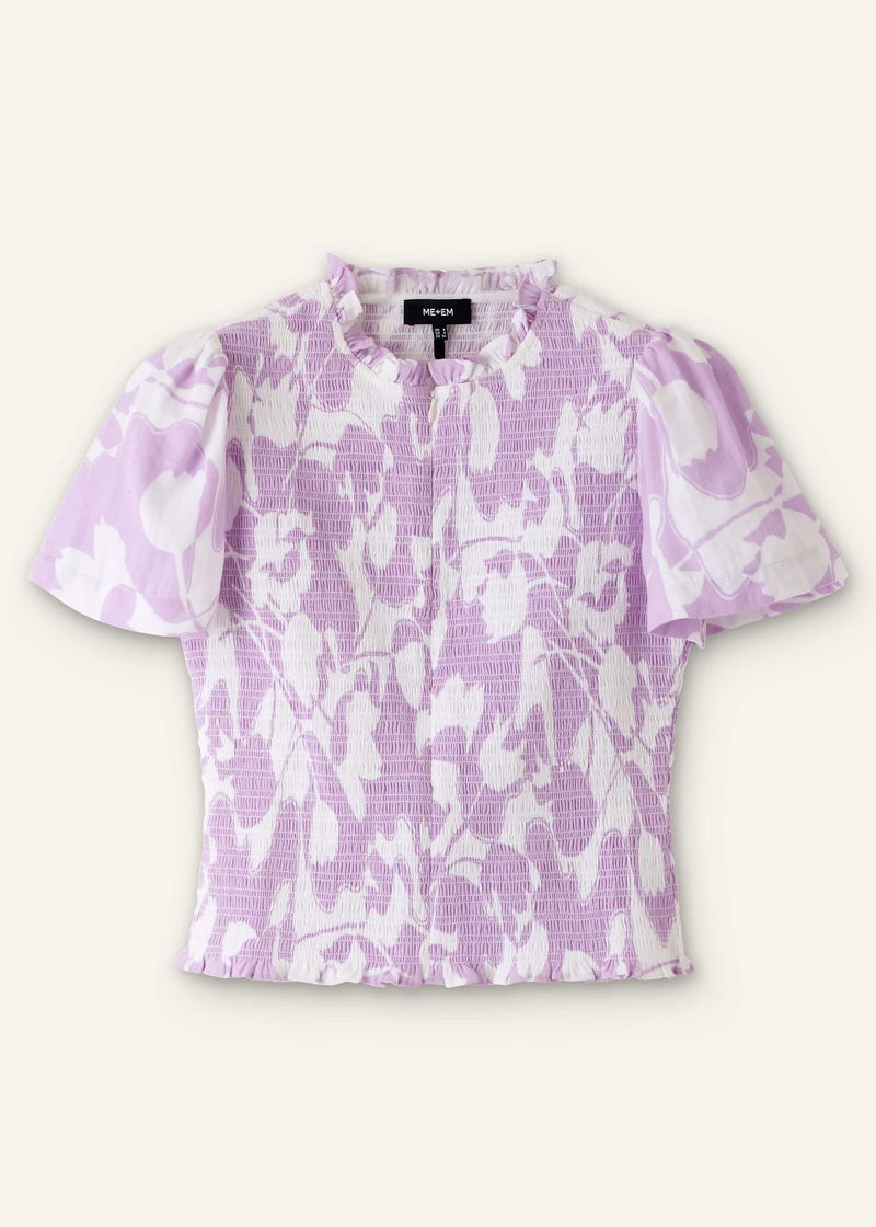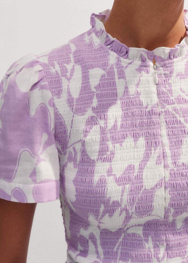 Cheesecloth Tulip Print Shirred Zip Top Soft White/Sherbet Lilac