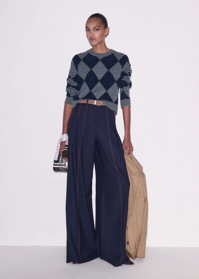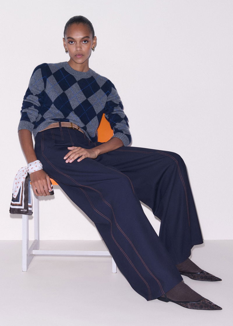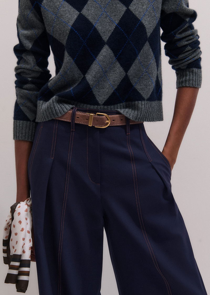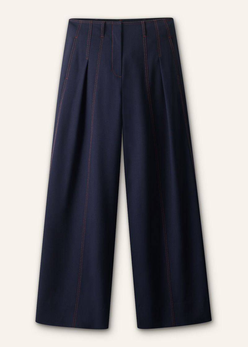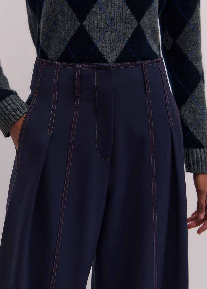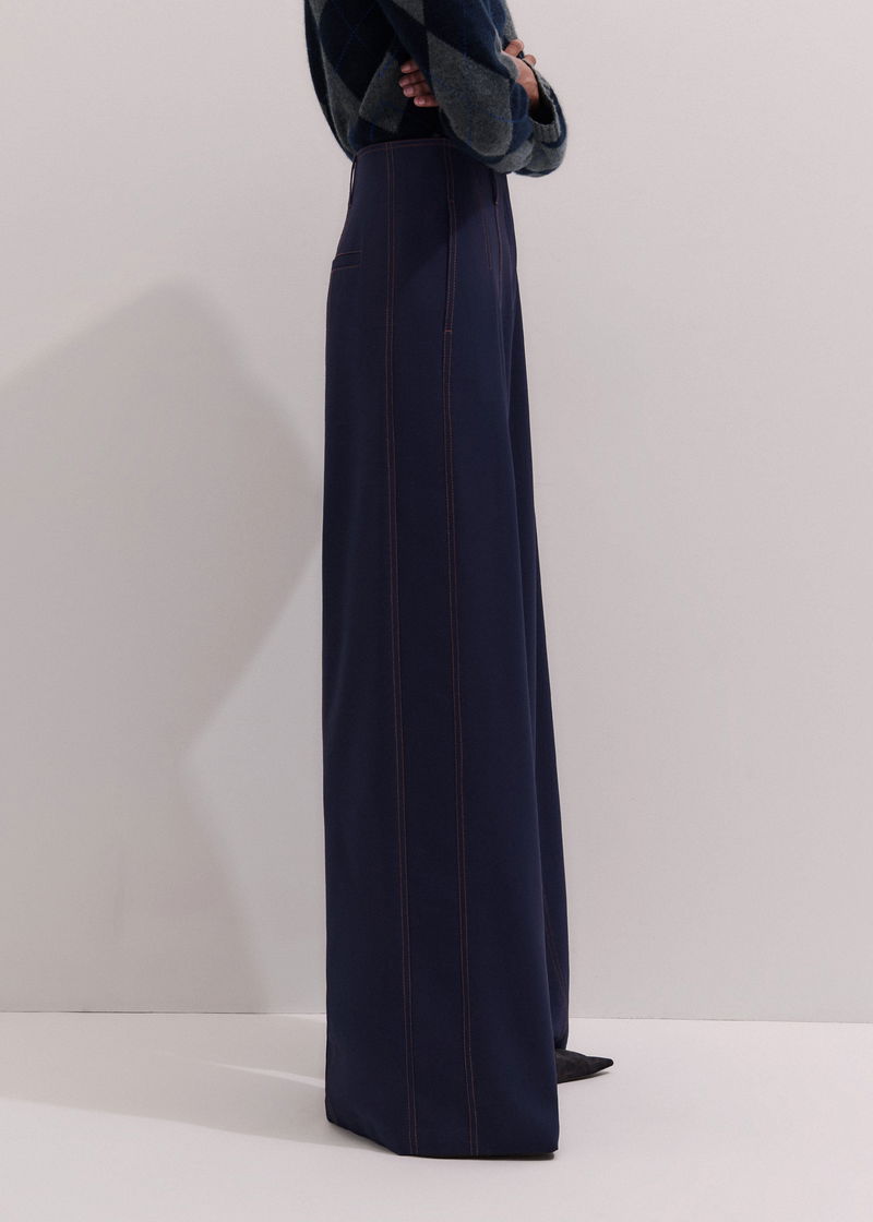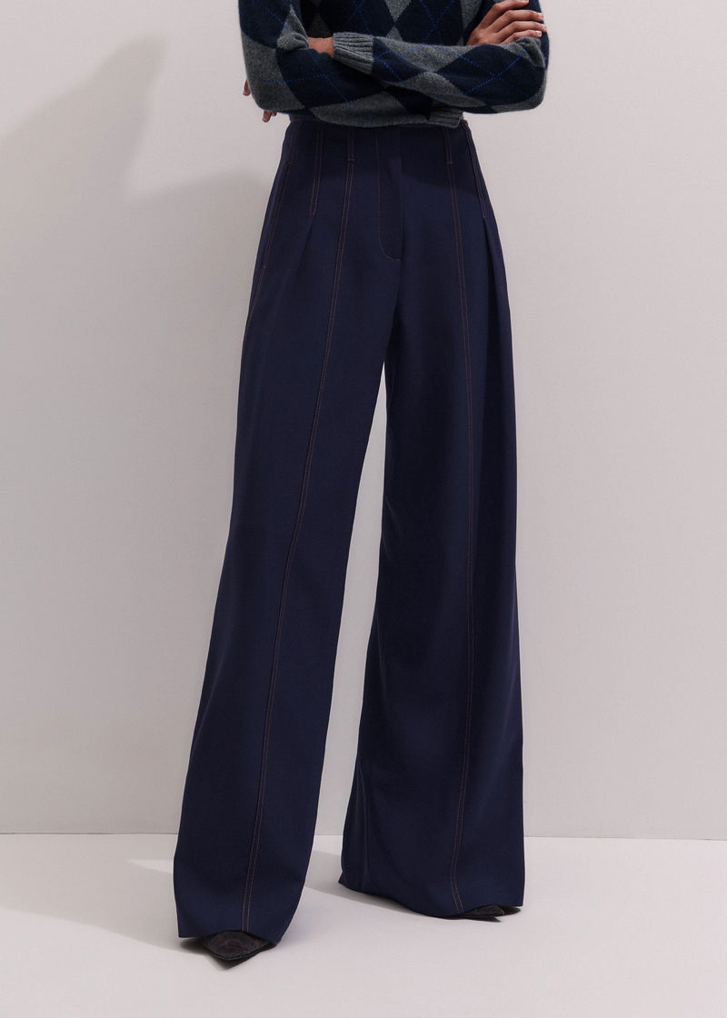 ME+EM's Navy Contrast Top Stitch Wide-Leg Trouser is designed with brown topstitching to highlight the wide-leg silhouette and create a more streamlined drape.