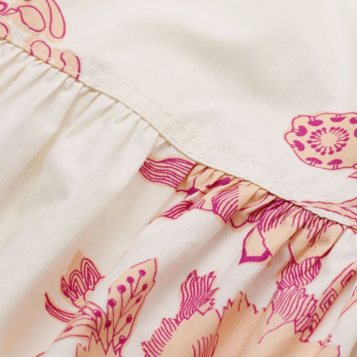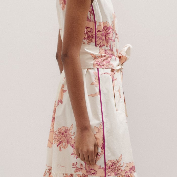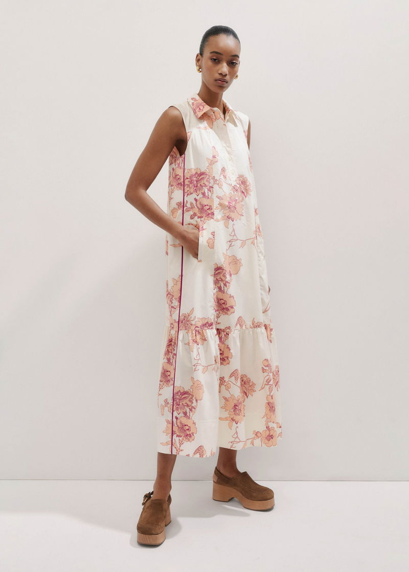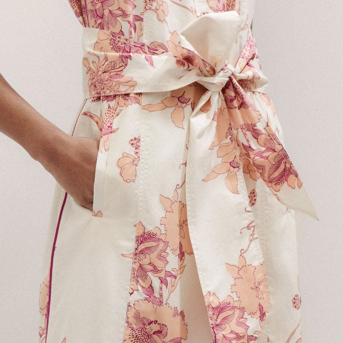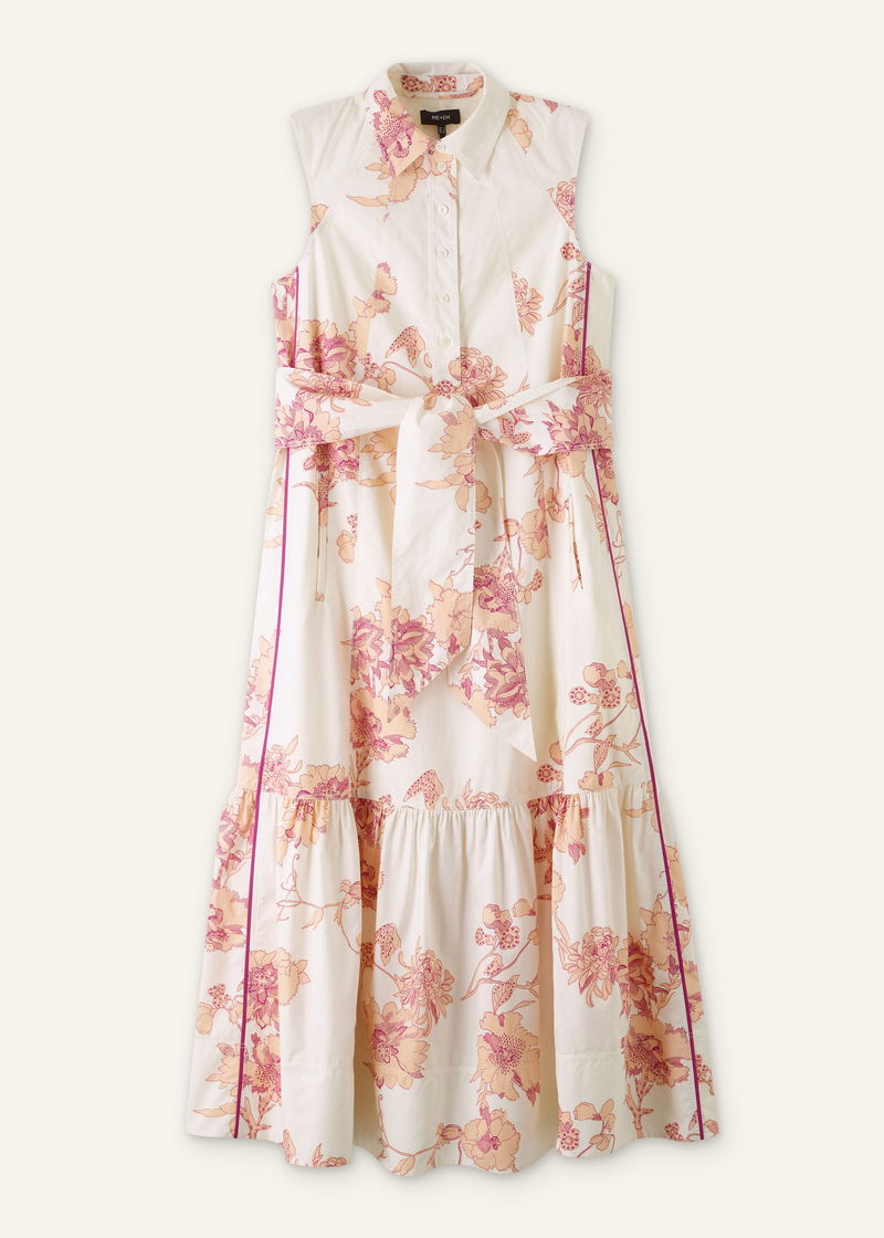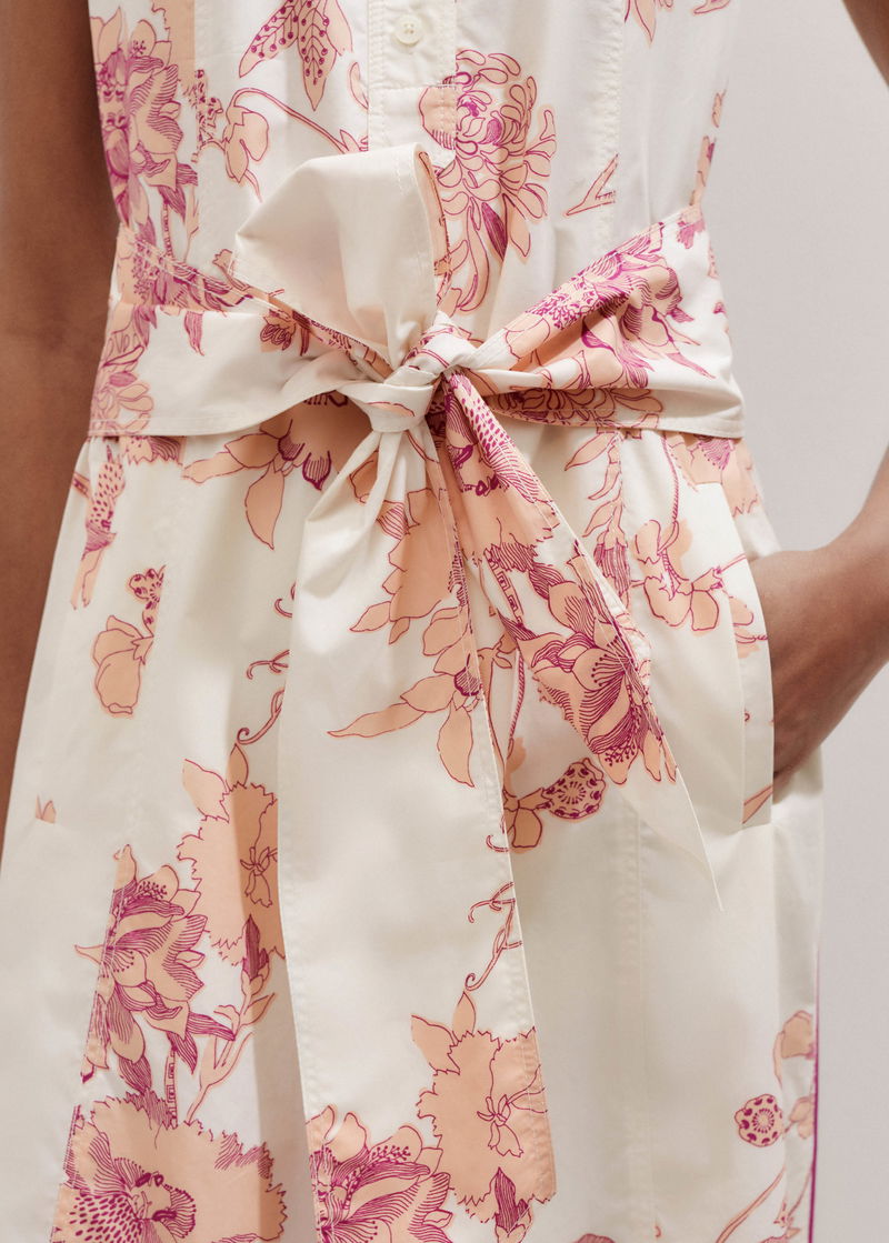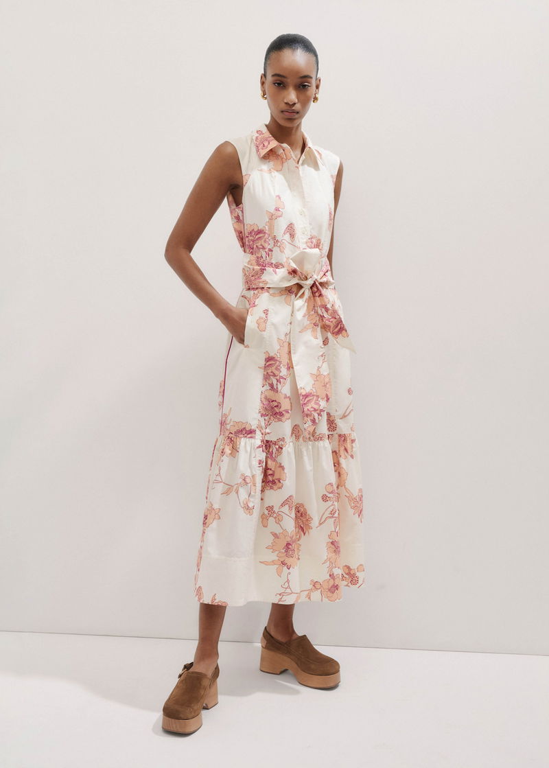 Cotton Scribbled Floral Print Maxi Shirt Dress + Belt Light Cream/Pink/Peach