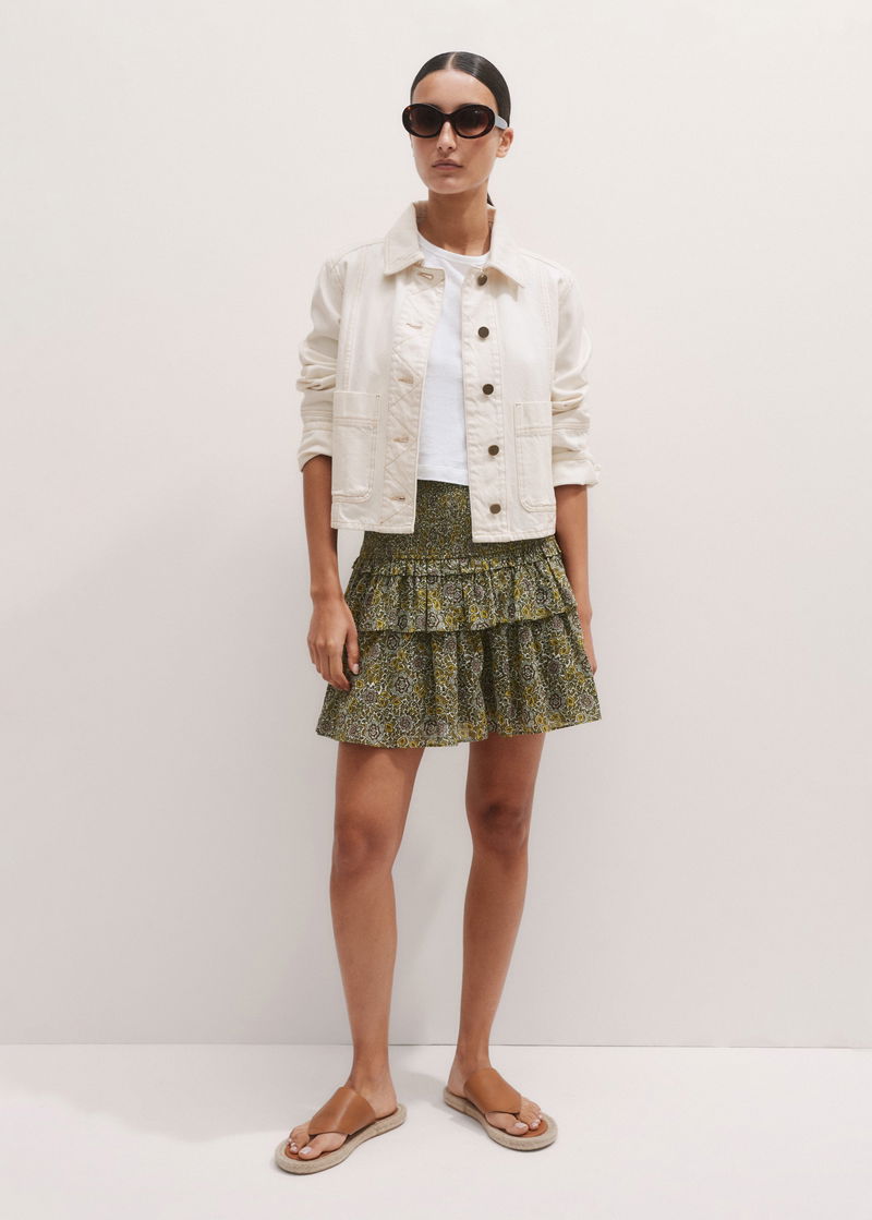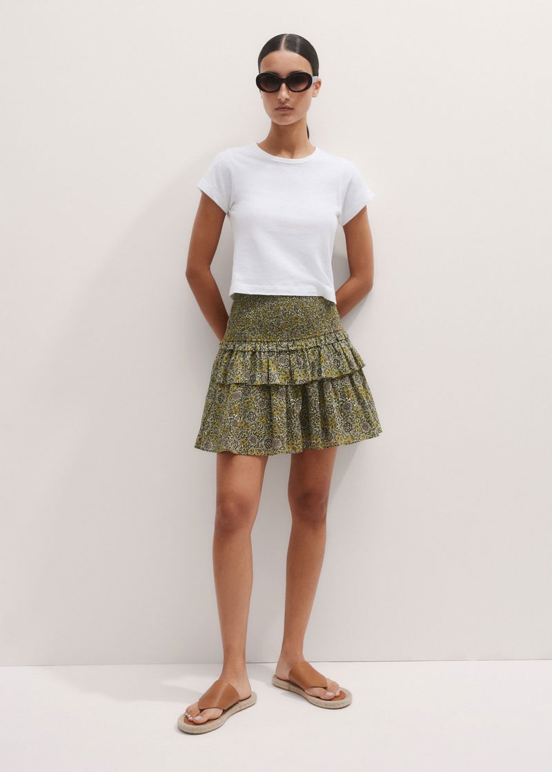 Cotton Trailing Lotus Print Shirred Mini Skirt Cream/Green/Multi