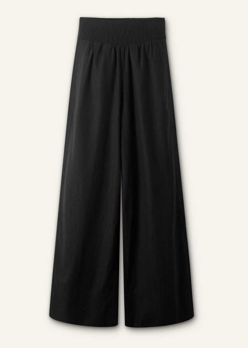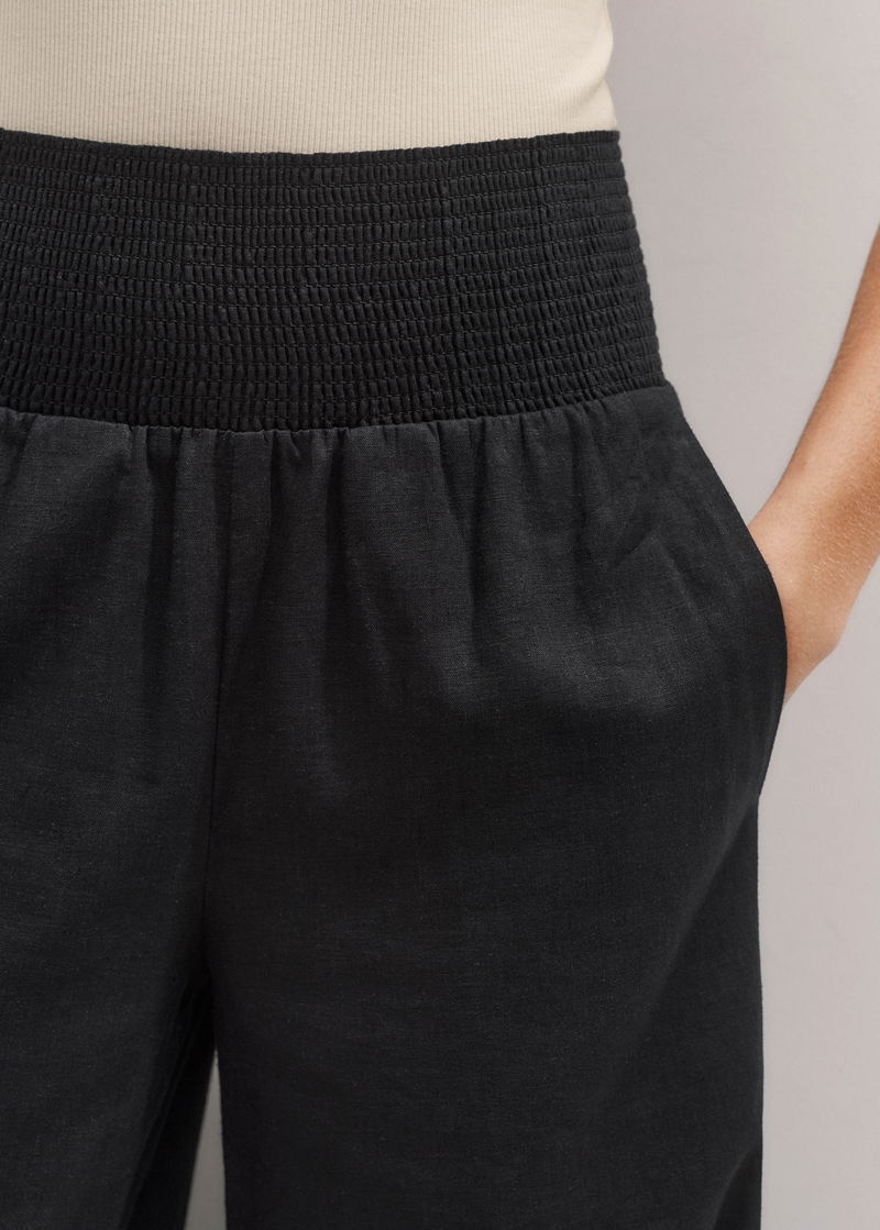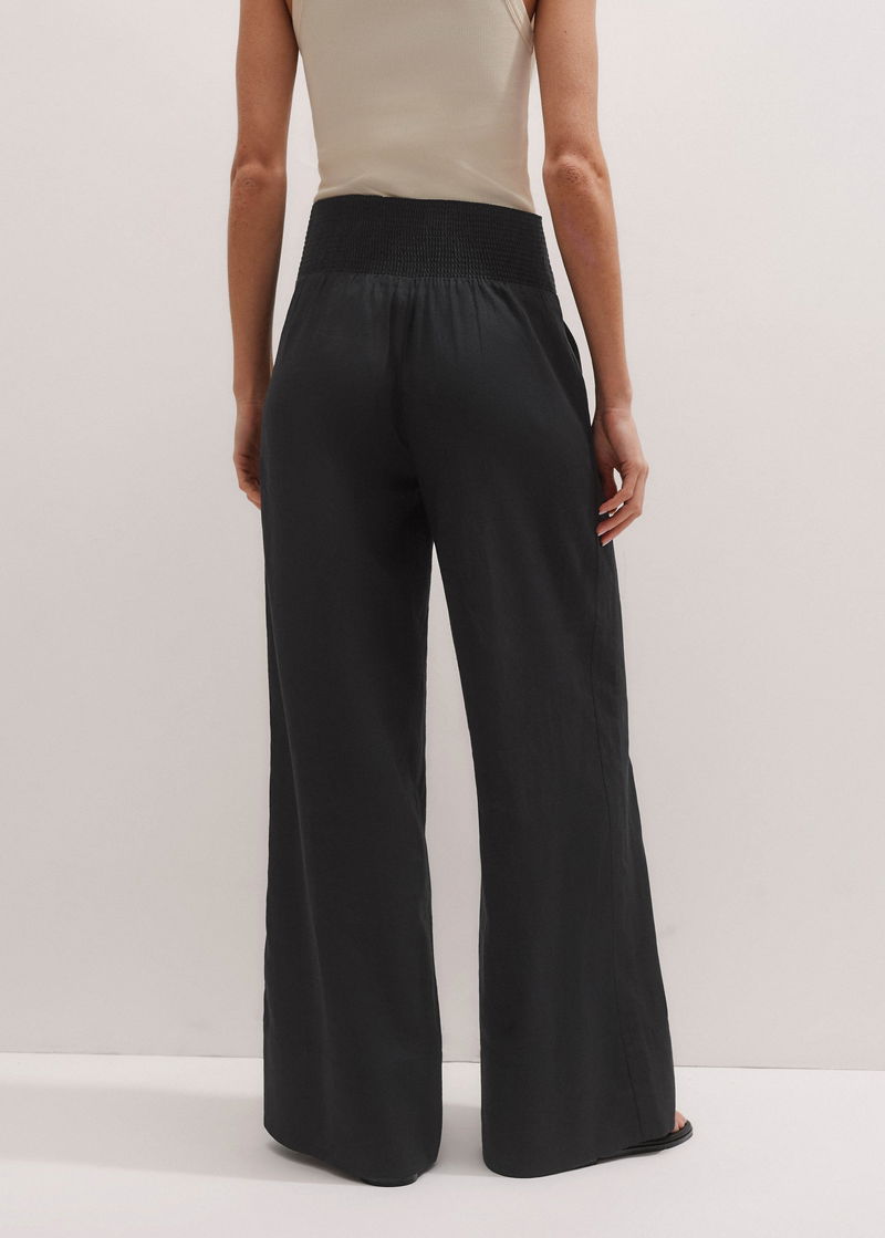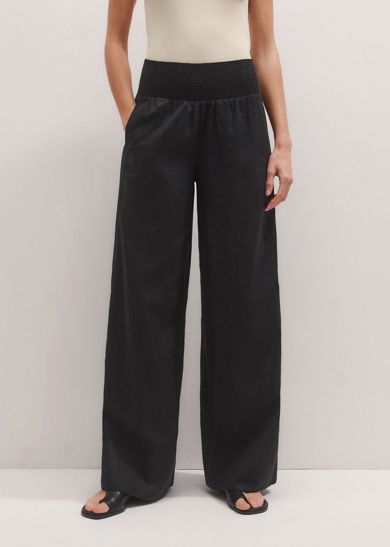 ME+EM's Black Shirred Waist Wide-Leg Trouser is crafted from linen blended with viscose to fortify the fabric against creasing for all-day polish.