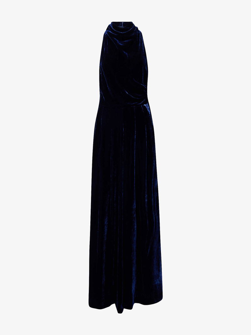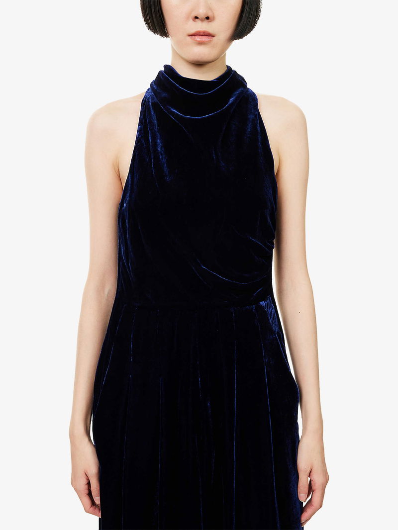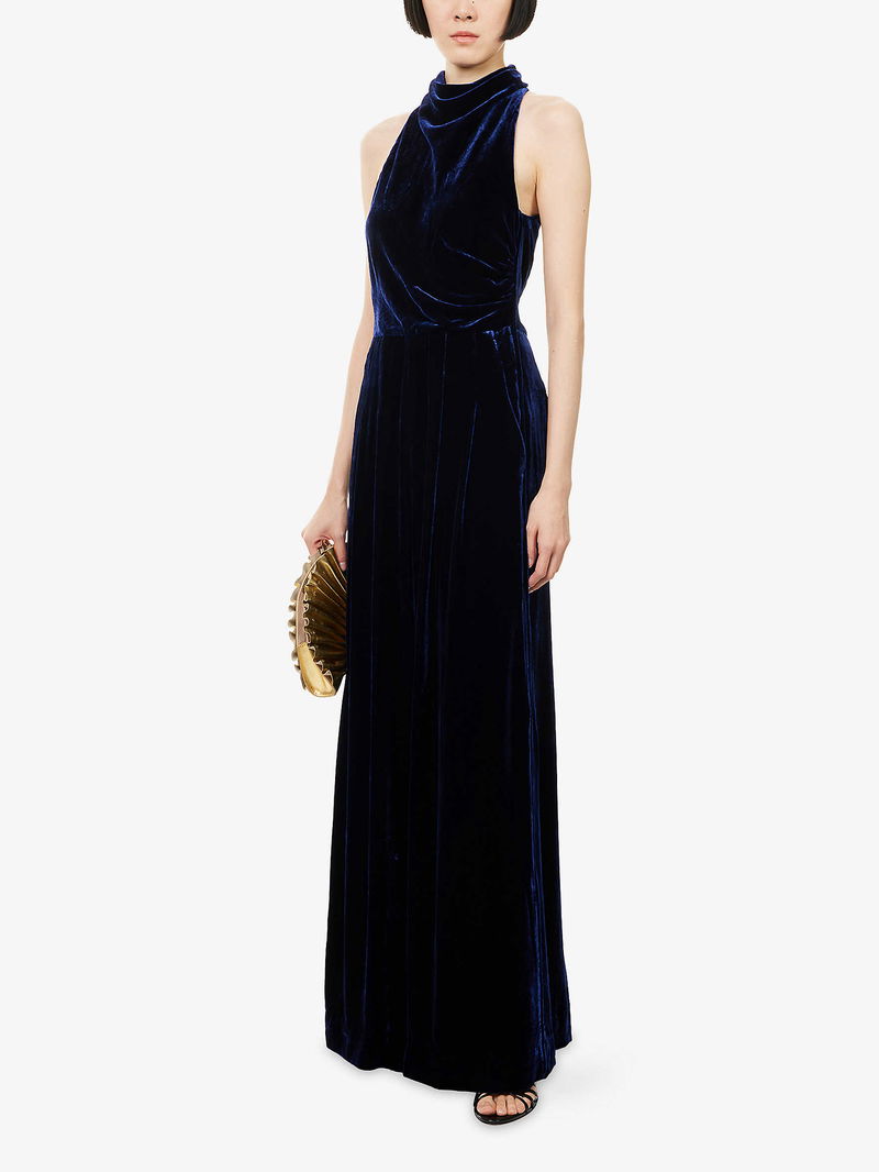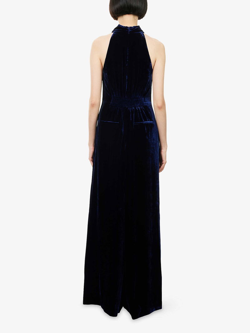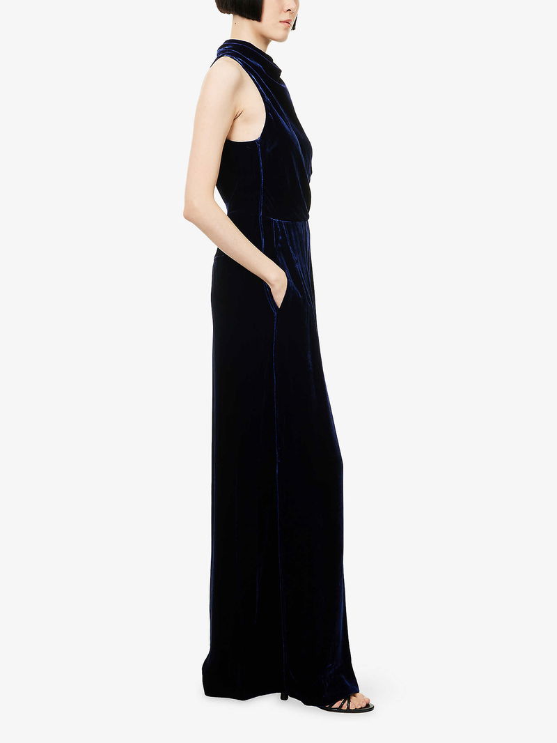 ME+EM velvet jumpsuit. Concealed zip fastening at back. Regular fit, draped neckline, sleeveless, wide leg, two side slip pockets, elasticated back panel, full length, velvet finish.