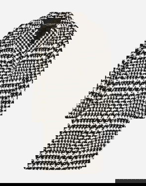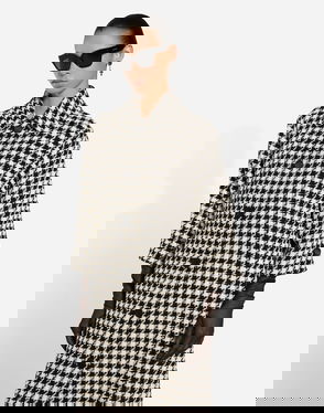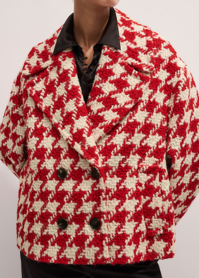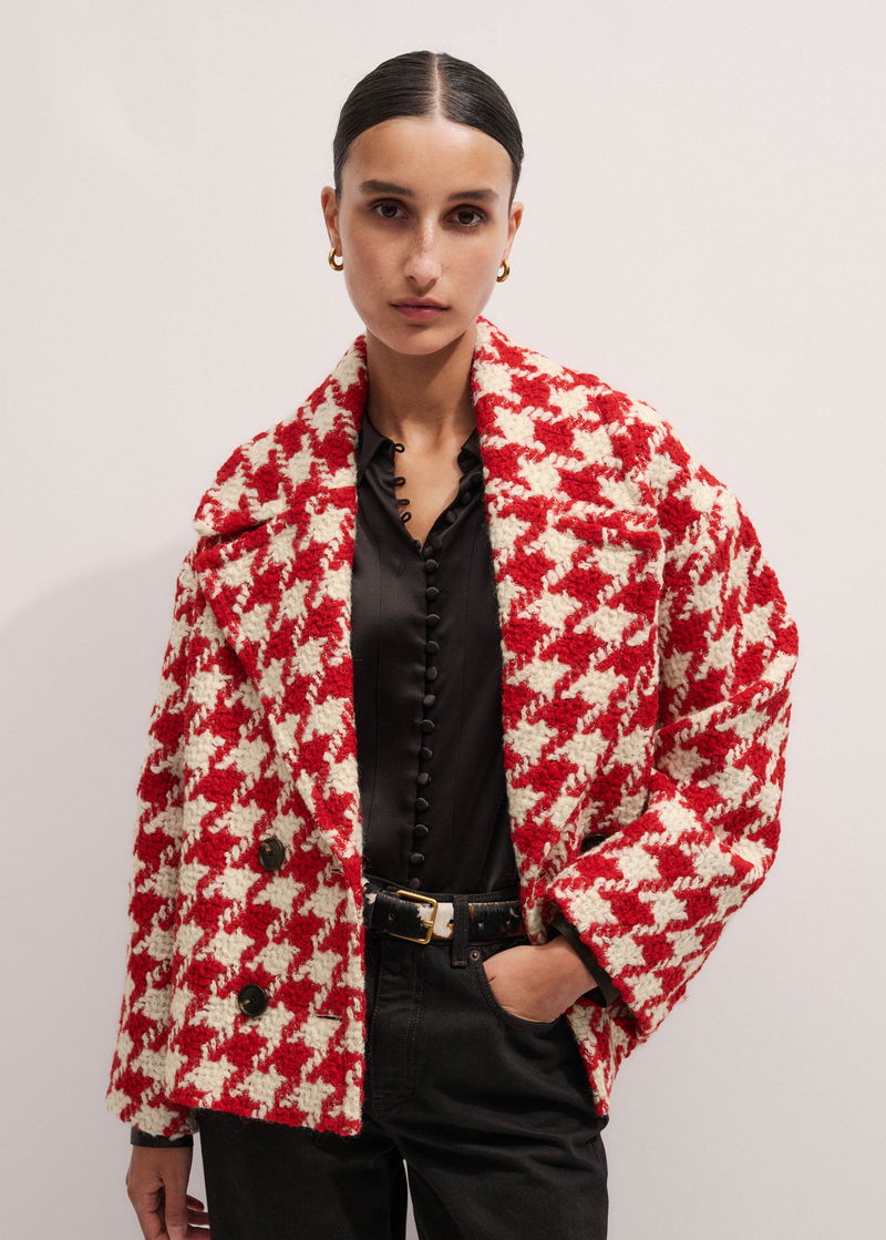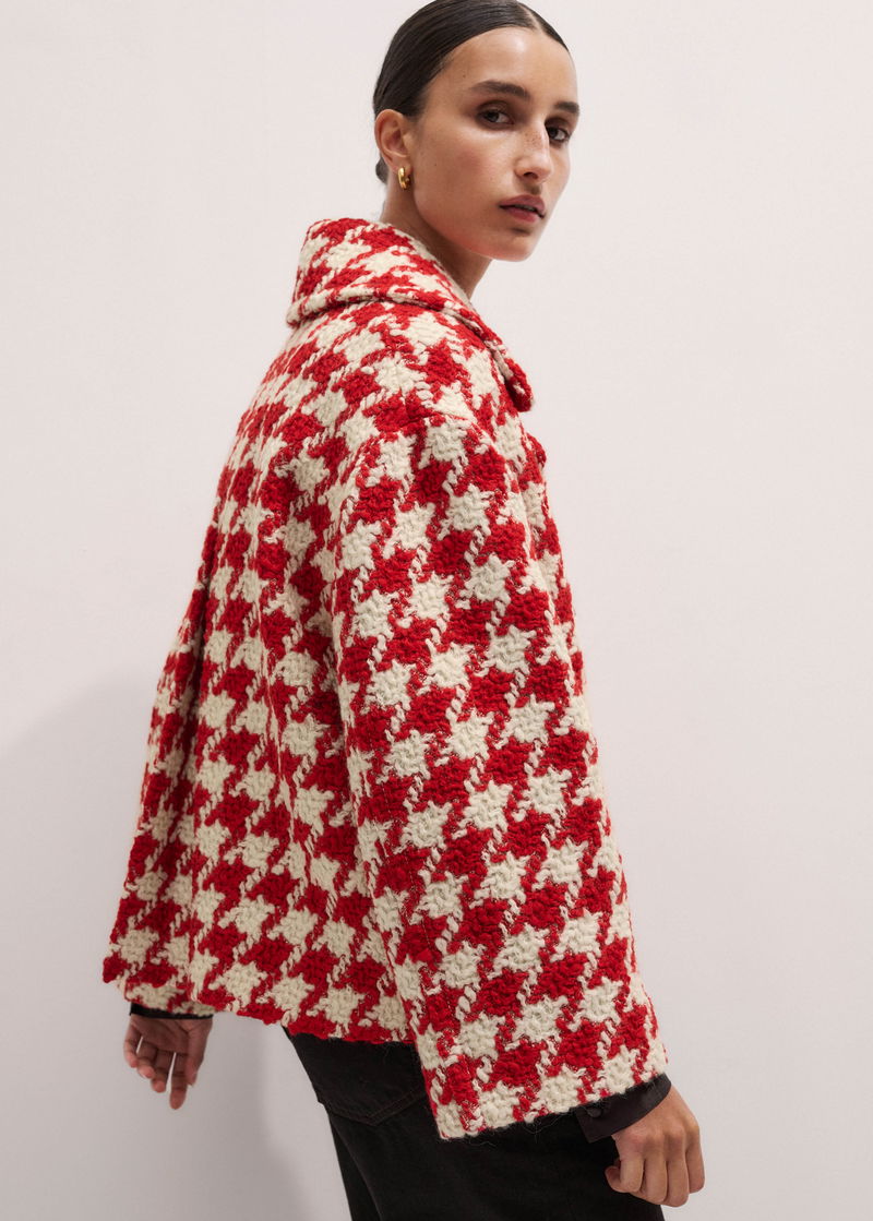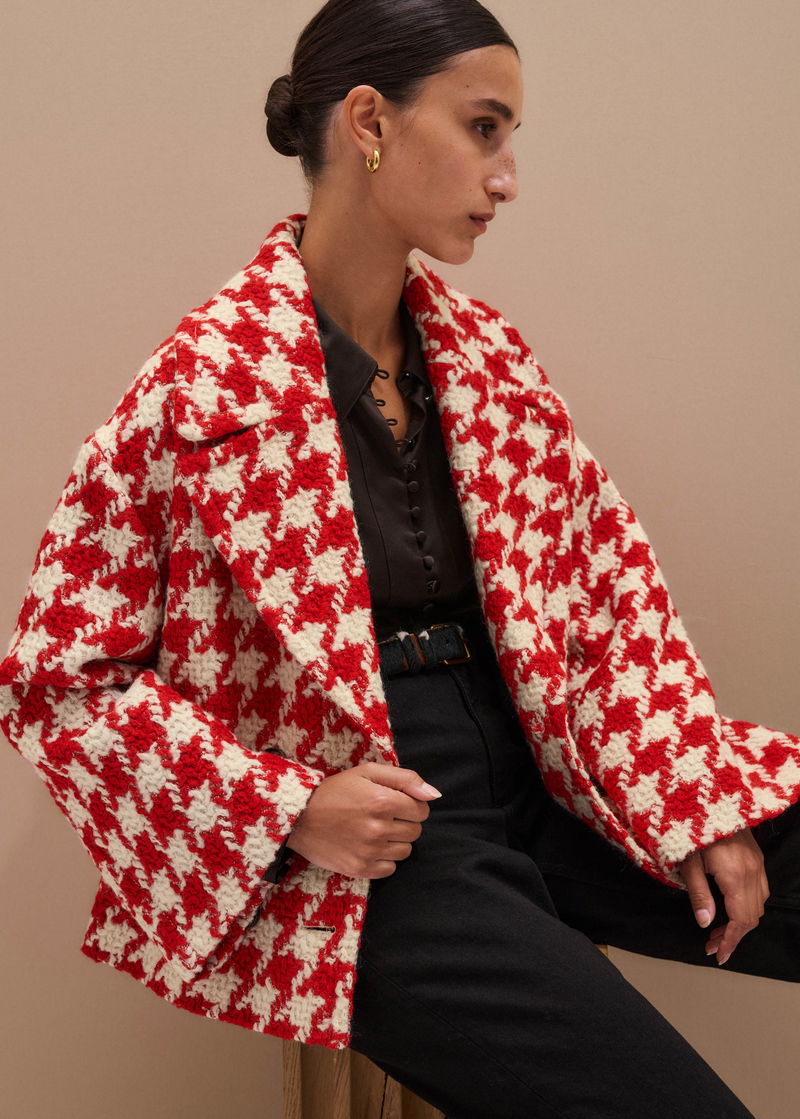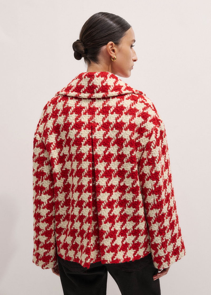 ME+EM's Red Exaggerated Houndstooth Statement Swing Coat has an intelligently placed darted seam at the back to maintain the swing shape.