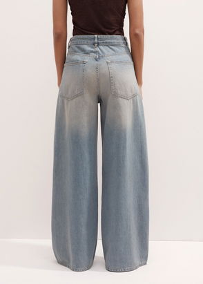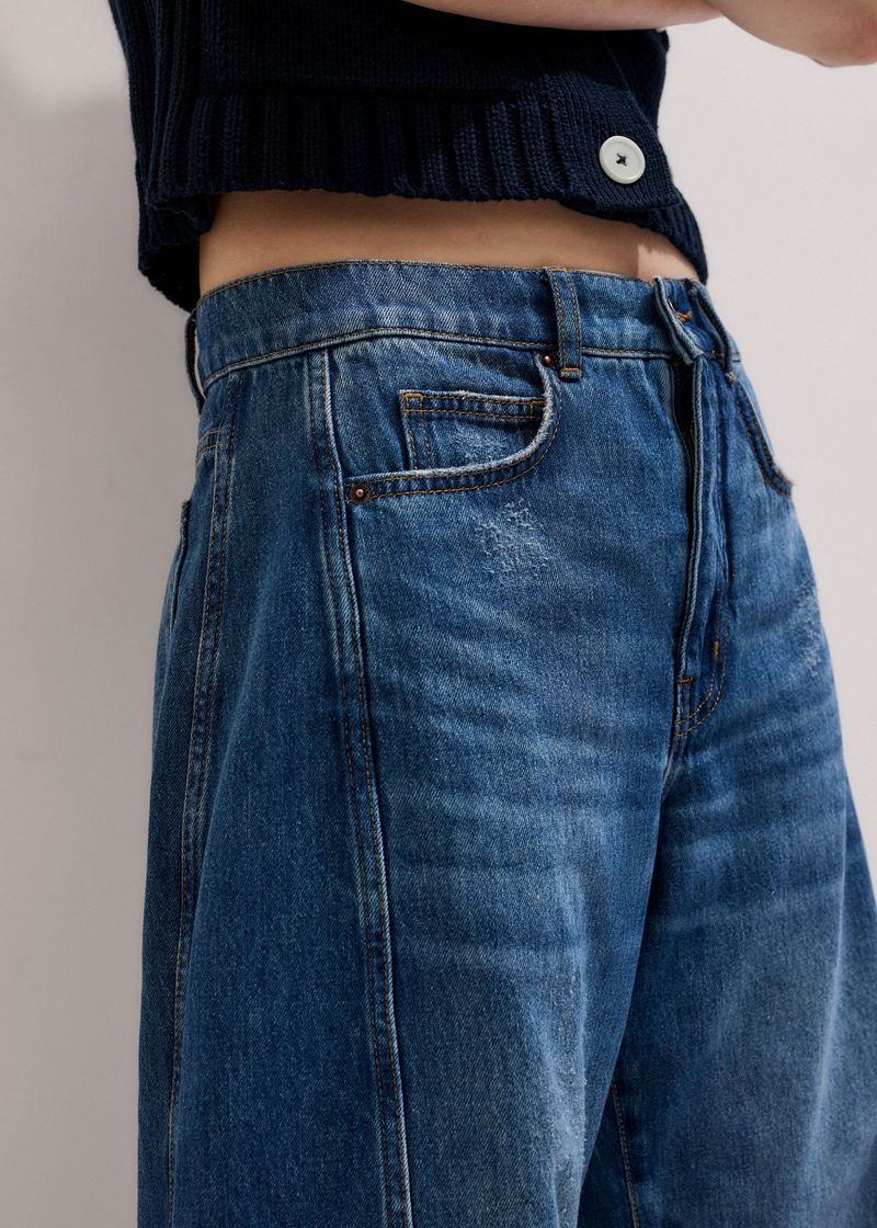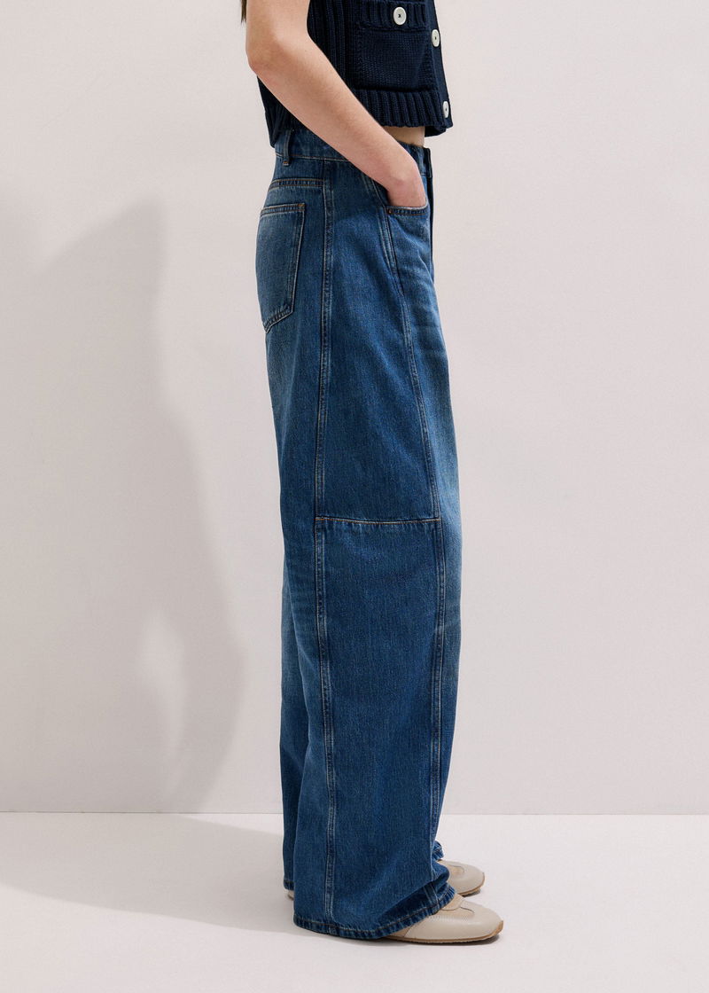 ME+EM's Mid Blue Exaggerated Tapered Jean features a side seam that curves in as it travels down the leg, creating a tapered silhouette and elongating the leg.