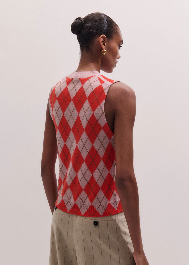 Fine Argyle Slim Knit Vest Smoke Pink/Poppy Red